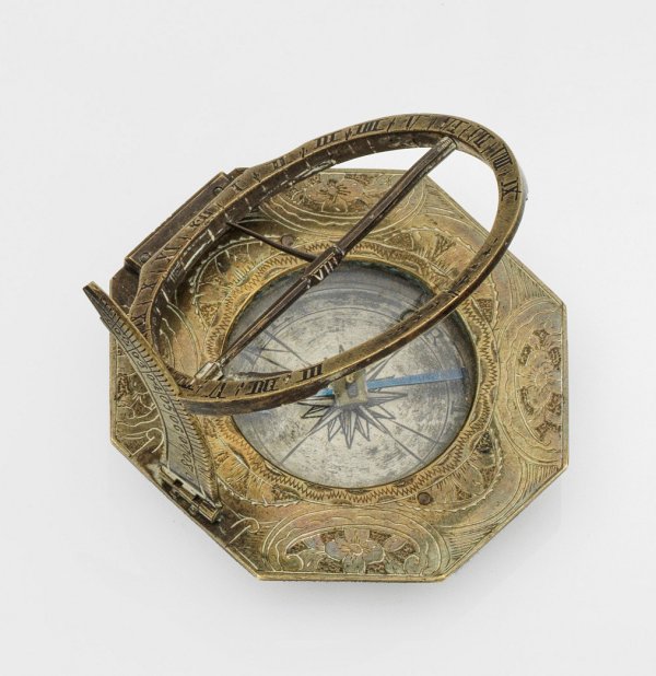 Messing, graviert. Oktogonaler Korpus mit eingelassenem Kompass, umzogen von graviertem Floraldekor. Versilberte Innenseite, gebläute Kompassnadel und Glasabdeckung. Klappbare Stundenskala mit scharniertem Gradbogen und schwenkbarem Stabgnomon. Rückseitig bez. u. a. mit der Angabe der Polhöhe für Korfu sowie sign. Lorenz Grassl (tätig zwischen 1760-1805). 5,2 cm x 5,6 cm.