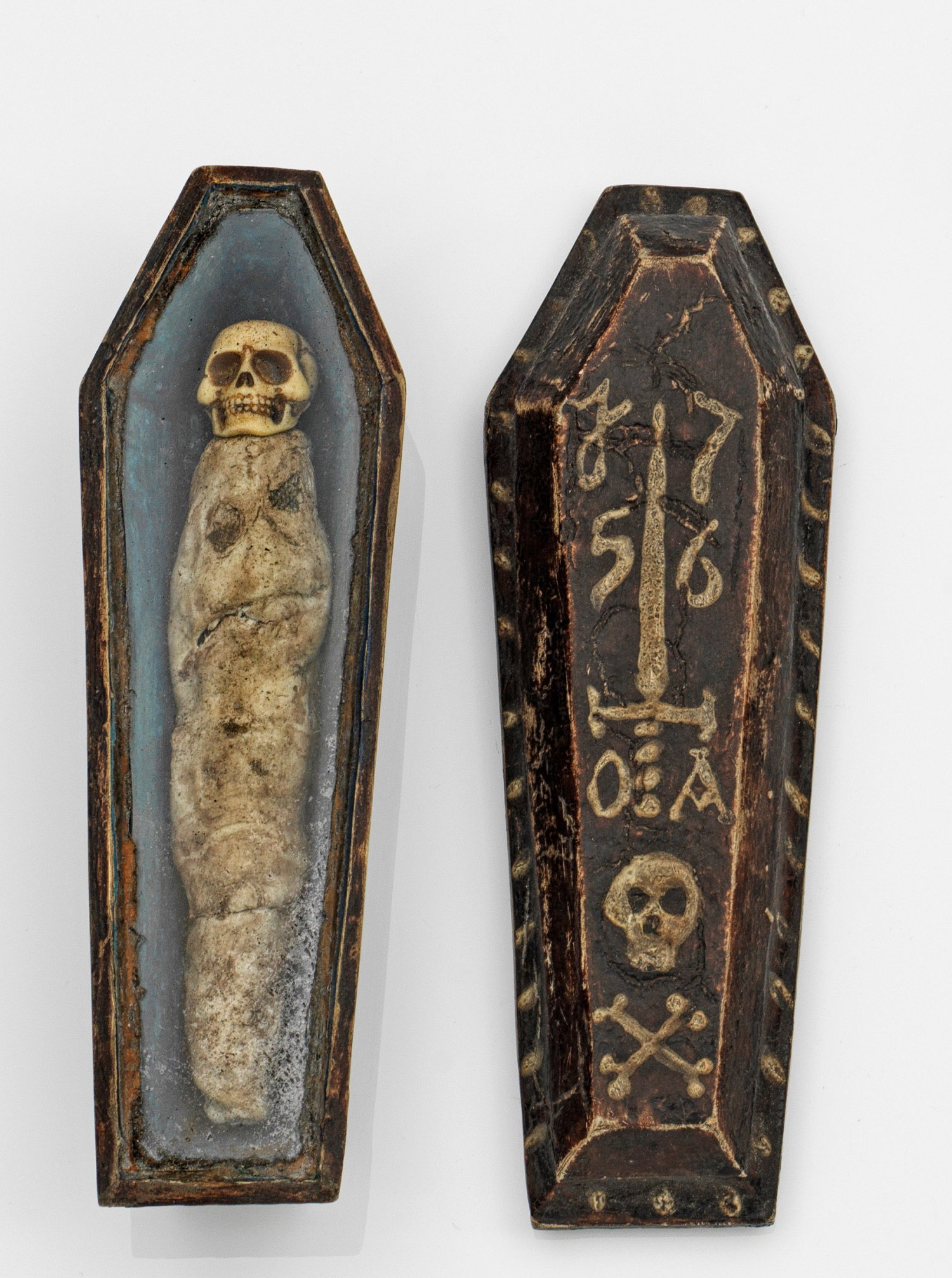 Holz, teilw. blau gefasst sowie Bein geschnitzt. Sargförmiger Korpus mit abnehmbarem, abgeschrägtem Deckel. Darauf gering erhabene, gemalte Initialien "OA", Schwert- sowie Totenkopfdarstellung. Dat. "1756". Unter Glas präsentierter Schädel aus geschnitztem Bein und gefatschter Körper. L. 18 cm.