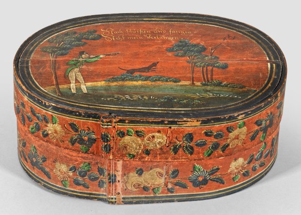 Weichholz, polychrom gefasst. Ovoider Korpus. Wandung flächendeckend mit Dekor aus üppigen Rosenblüten und Blattranken über rotfarbenem Fond. Auf dem Deckel Darstellung einer bewaldeten Landschaft mit Hund und Jäger die Flinte im Anschlag auf drei Vögel schießend, bez. "Nach Schießen und fangen Steht mein Verlangen". Altersbedingte Gebrauchsspuren. H. 20 cm. 45,5 cm x 30 cm.