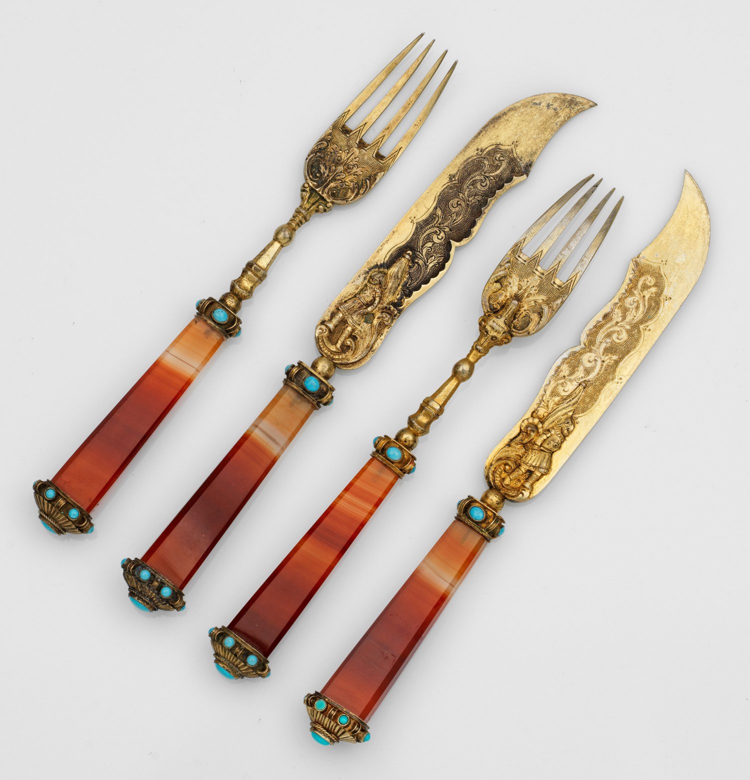 Silber, vergoldet und Bandachat. 4-tlg.; 2 Messer und 2 Gabeln. Facettiert geschliffene, konische Griffe aus fein gebändertem rot-orangenem und weißen Bandachat. Profilierte Zwingen und Griffkappen teilw. durchbrochen gearbeitet und verziert mit gefassten Türkiscabochons. Schneide und Zinken figural bzw. floral reliefiert sowie graviert mit Blattranken über punziertem Grund. Gew. zus. ca. 185 g. L. 19 cm - 20,5 cm.