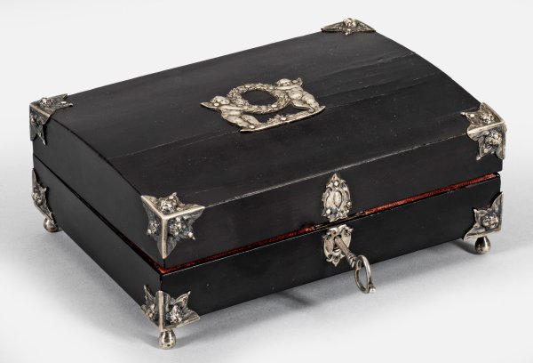 Holz, ebonisiert mit Silberbeschlägen. Rechteckige, flache Form mit scharniertem Deckel auf vier Kugelfüßen. Ecken mit Beschlägen in Form von reliefplastischen Cherubsköpfen. Scharniere mit Maskaronen verziert. Auf dem Deckel zentral appliziert und durchbrochen gearbeitet, zwei Putti einen Lorbeerkranz tragend. Schauseitiges Schloss mit volutierter Kartusche. Innen mit dunkelrotem Samt ausgekleidet. Schlüssel unidentifiziert gest.; Minim. Spannungsrisse. H. 7,5 cm. 19 cm x 14 cm.