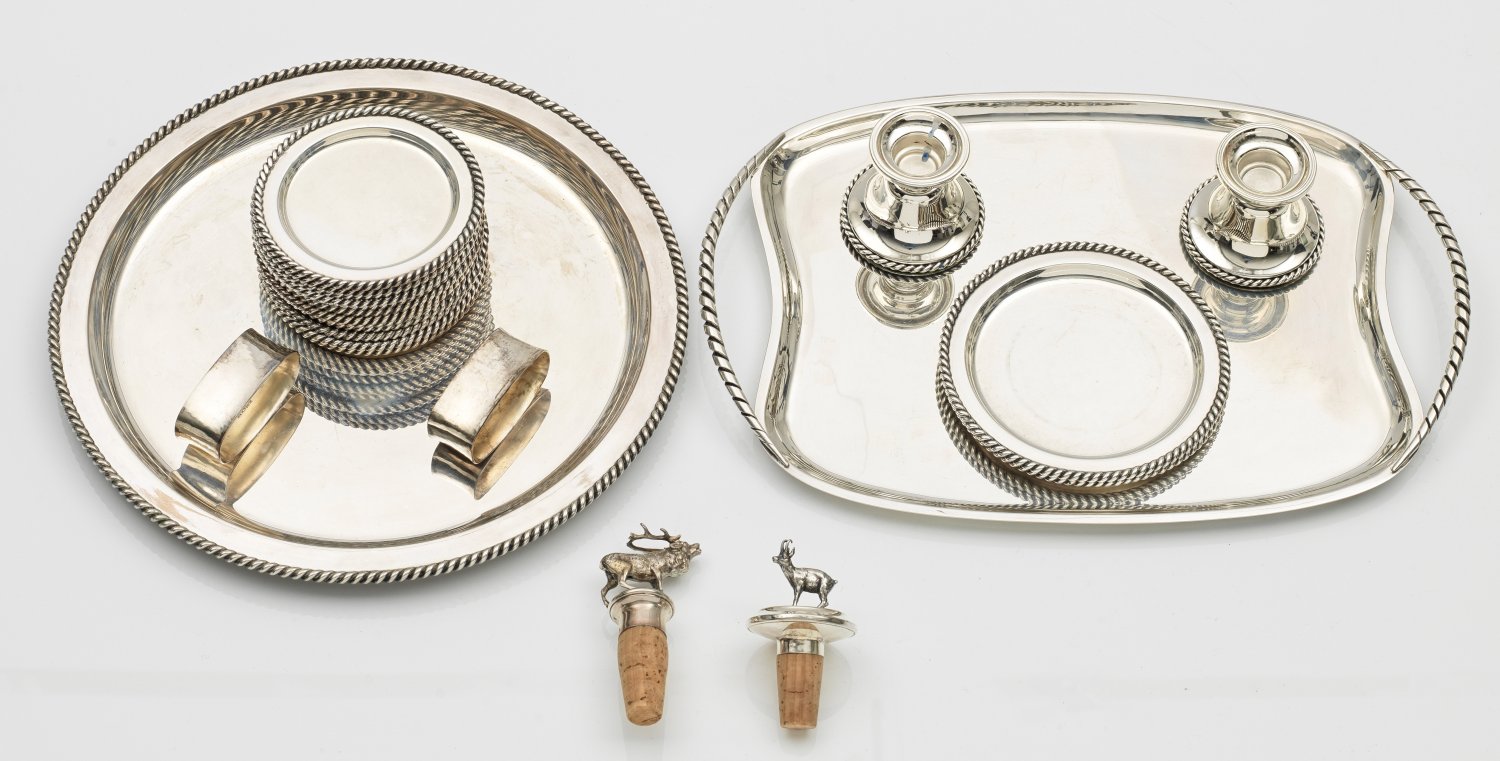 Silber, Sterlingsilber. 22-tlg.; Ein Henkeltablett, eine runde Anbietplatte, zwei kleine Tafelleuchter, zwei Serviettenringe, zwei figürliche Korken, zwei Flaschen- und 12 Glasuntersetzer. Teilw. mit Rand in Form eines reliefplastischen Kordelbandes. Gest. 800, 835, 925, div. Herstellerzeichen. Gew. zus. ca. 2945 g. D. 10,5 cm - 29,5 cm.