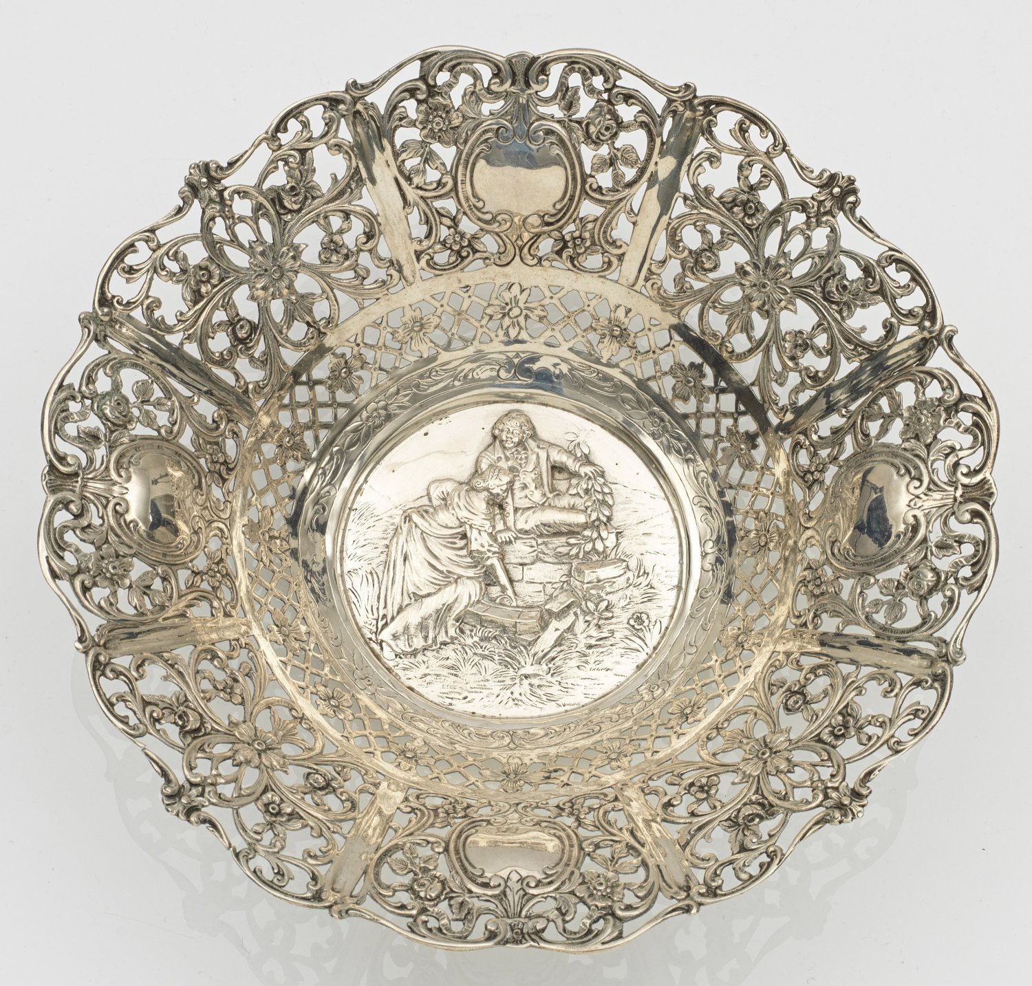Silber. Runde Form. Vertiefter Spiegel mit reliefplastischer Darstellung eines Paares an einem Brunnen sitzend. Weit ausschwingende, durchbrochen gearbeitete, passig geschweifte Fahne verziert mit üppig volutierten Blattranken, Blüten und Gitterwerk. Gest. 800, Herstellerzeichen. Gew. ca. 360 g. H. 7 cm. D 27 cm