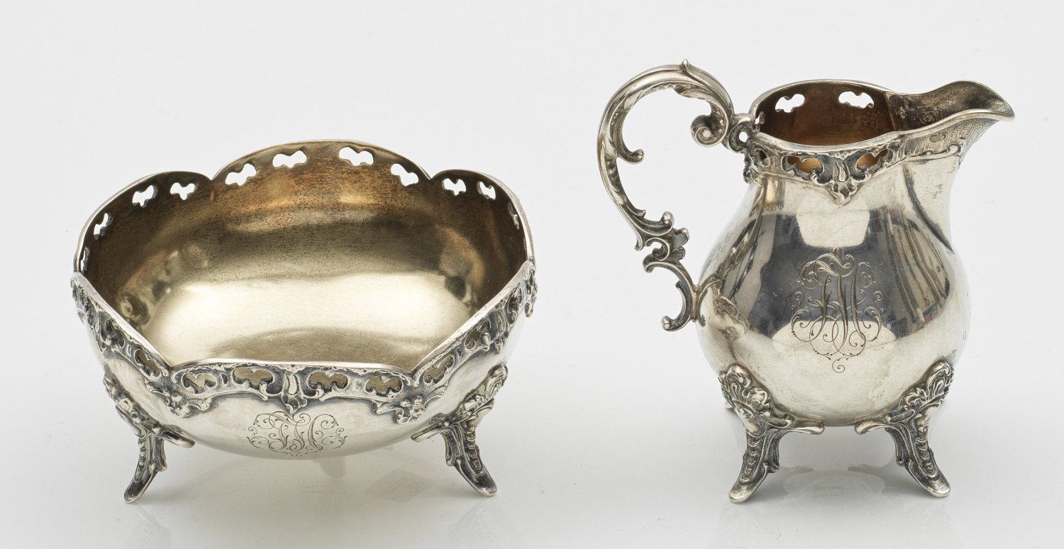 Silber. Über vier ausgestellten Rocaillenfüßen, bauchiger glatter Korpus. Die Randzone aus durchbrochen gearbeitetem, reliefplastischem Blattwerk. Seitlich korrespondierender, volutierter Rocaillenhenkel. Schauseitig graviertes und ligiertes Monogramm. Innen vergoldet. Minim. best.; Gest. 800, Händlermarke und Herstellerzeichen. Gew. zus. ca. 290 g. 6 cm - 11 cm.