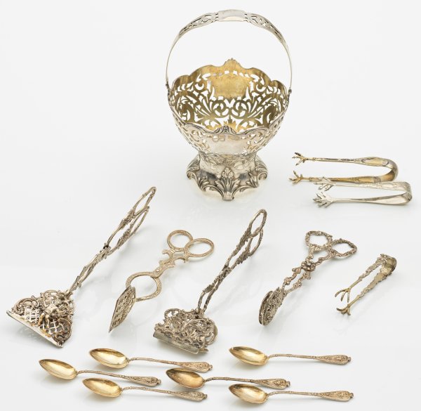 Plated und Silber. 14-tlg.; Durchbrochen gearbeiteter Henkelkorb, vier Gebäckzangen, drei Zuckerzangen sowie sechs Mokkalöffel. Teilw. gest. 800 und gem.; Gew. zus. ca. 530 g.