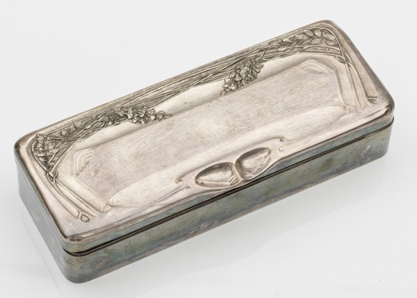 Plated, Holz. Längsrechteckiger Korpus mit gerundeten Ecken und Kanten. Auf dem Scharnierdeckel vegetabiler Dekor in verschlungenen Ästen mit Blättern und üppigen Blütentrauben, eine sog. Glyzinie oder auch Blauregen darstellend. Das Innere mit Zedernholz ausgekleidet. Passig geschweifter, gemuldeter Drücker. Minim. Gebrauchsspuren, teilw. best.; H. 7,5 cm. 33,5 cm x 13 cm.