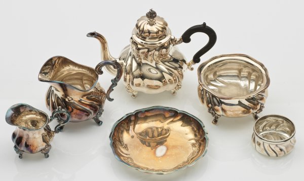 Sterlingsilber. 6-tlg.; Teekanne, Milch- und Sahnegießer, Zucker-, Kandis- sowie kleine Anbietschale. Über Rocaillenfüßen, bauchig gedrückter Korpus, von geschweiften Zügen gegliedert. Gest. 925, div. Herstellerzeichen. Gew. zus. ca. 870 g. H. 2 cm - 15,5 cm.