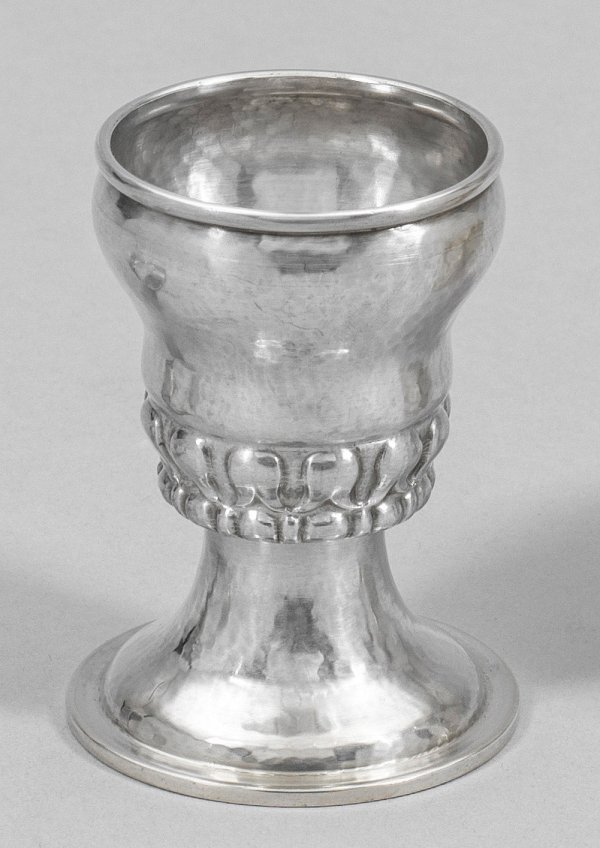 Sterlingsilber. Trompetenförmig ansteigender Stand, übergehend in konische, wulstartig gegliederte Kuppa. Am Ansatz umzogen von reliefplastischem, stilisiertem Blütenkelchdekor. Korpuswandung mit feinem Hammerschlagdekor. Modell "129". Gest. 925, Herstellerzeichen. Gew. ca. 45 g. H. 7 cm.