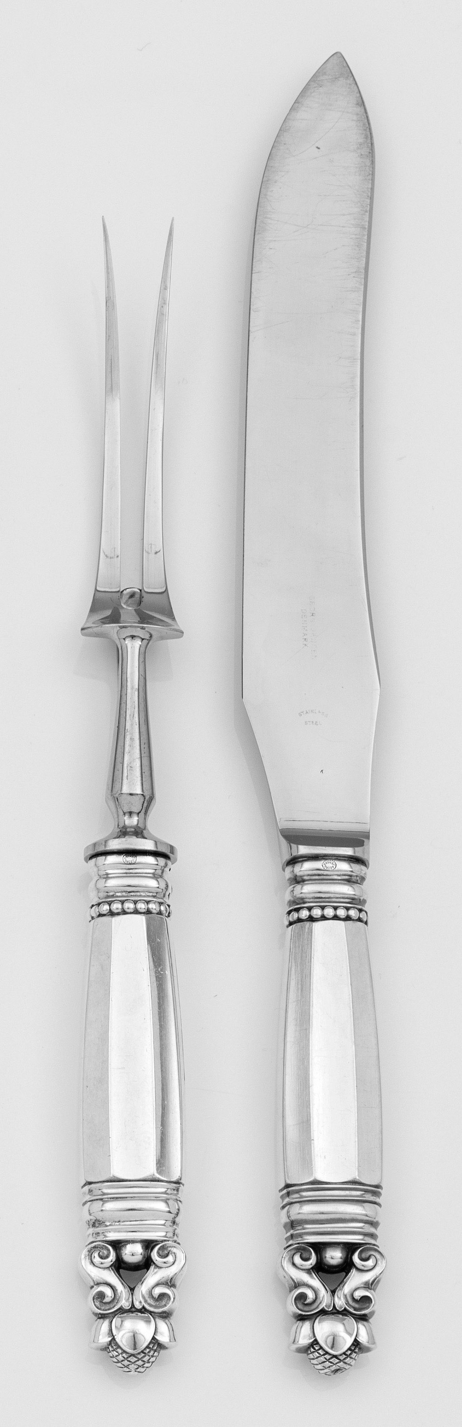 Sterlingsilber. 2-tlg.; Lange, geschweifte Klinge bzw. zweizinkige Gabel. Sich konisch erweiternder, kannelierter Griff mit durchbrochen gearbeiteter Knospenbekrönung. Modell "Acorn". Entw. Johan Rohde, 1915. Gest. "Sterling", Herstellerzeichen. Gew. ca. 325 g. L. 27 cm - 32 cm.