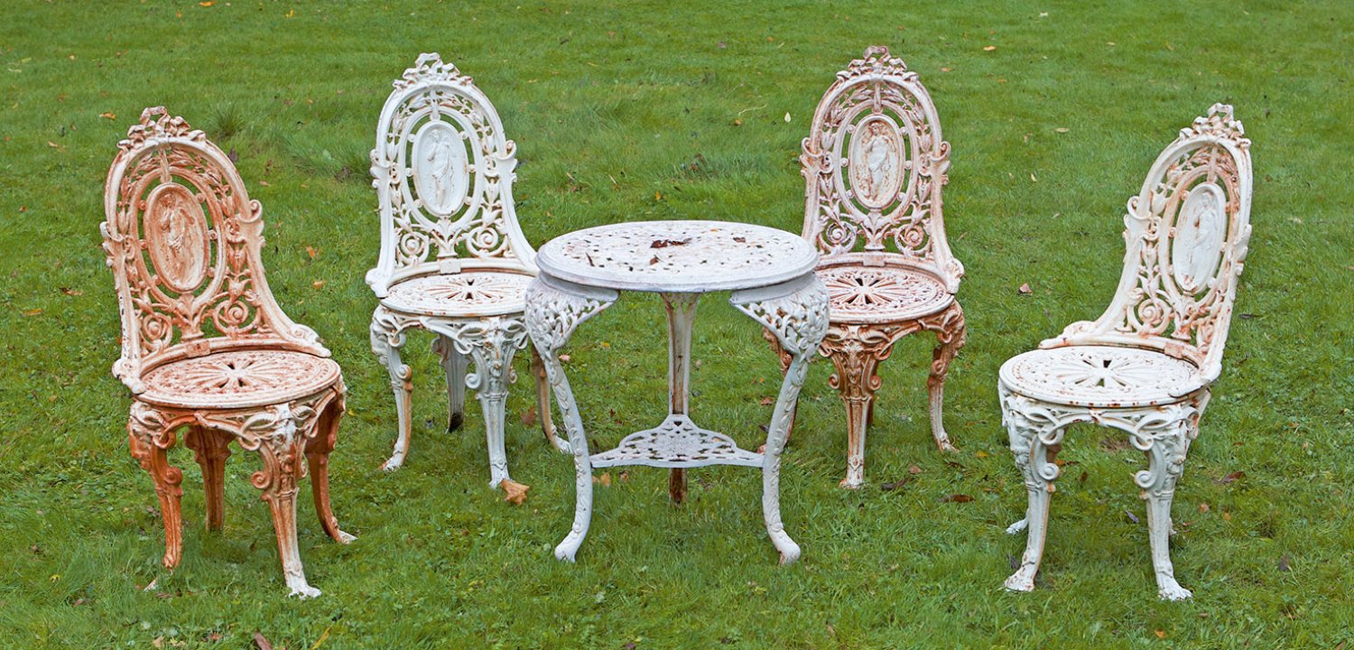 5-tlg.; Tisch und vier Stühle. Gusseisen, weiß lackiert. Stark geschwungene, teilw. durchbrochen gearbeitete Beine als Träger für runde Deckplatte, unterhalb durch Steg verbunden. Stühle aus stark eingezogenen Beinen mit reliefplastisch gestalteten Widderköpfen und rosettenförmiger Sitzfläche. Hochgewölbte Rückenlehne mit großem Medaillonmotiv. Tisch-H. 66 cm. D. 57 cm. Sitz-H. 41 cm.