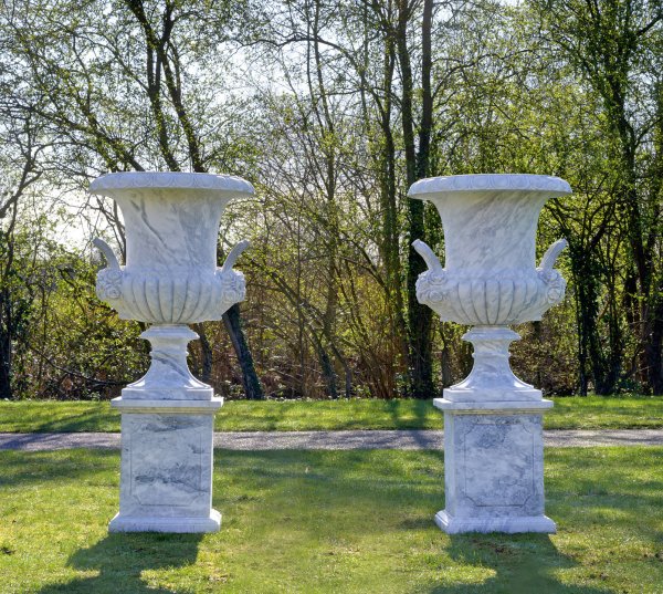 A pair of monumemntal Italian white marble park vases with pedestals.
