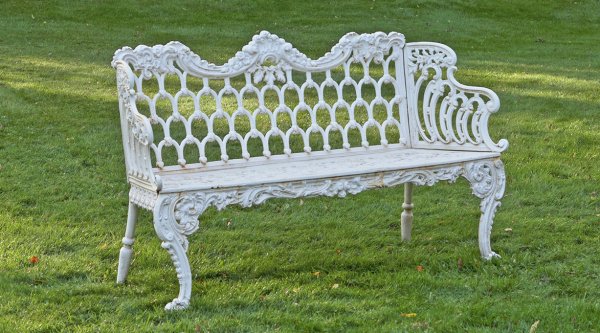 Gusseisen, weiß lackiert. Volutenförmig durchbrochen gearbeitete Sitzfläche auf blattornamentierter Zarge und stark geschwungenen Beinen. Geschweift ansteigende Armlehnen sowie hoch aufgeworfene Rückenlehnenrahmung aus Rocaillen und Gitterwerk. Bez. "Carron". H. 91 cm. 158 cm x 45 cm. Sitz-H. 44 cm.