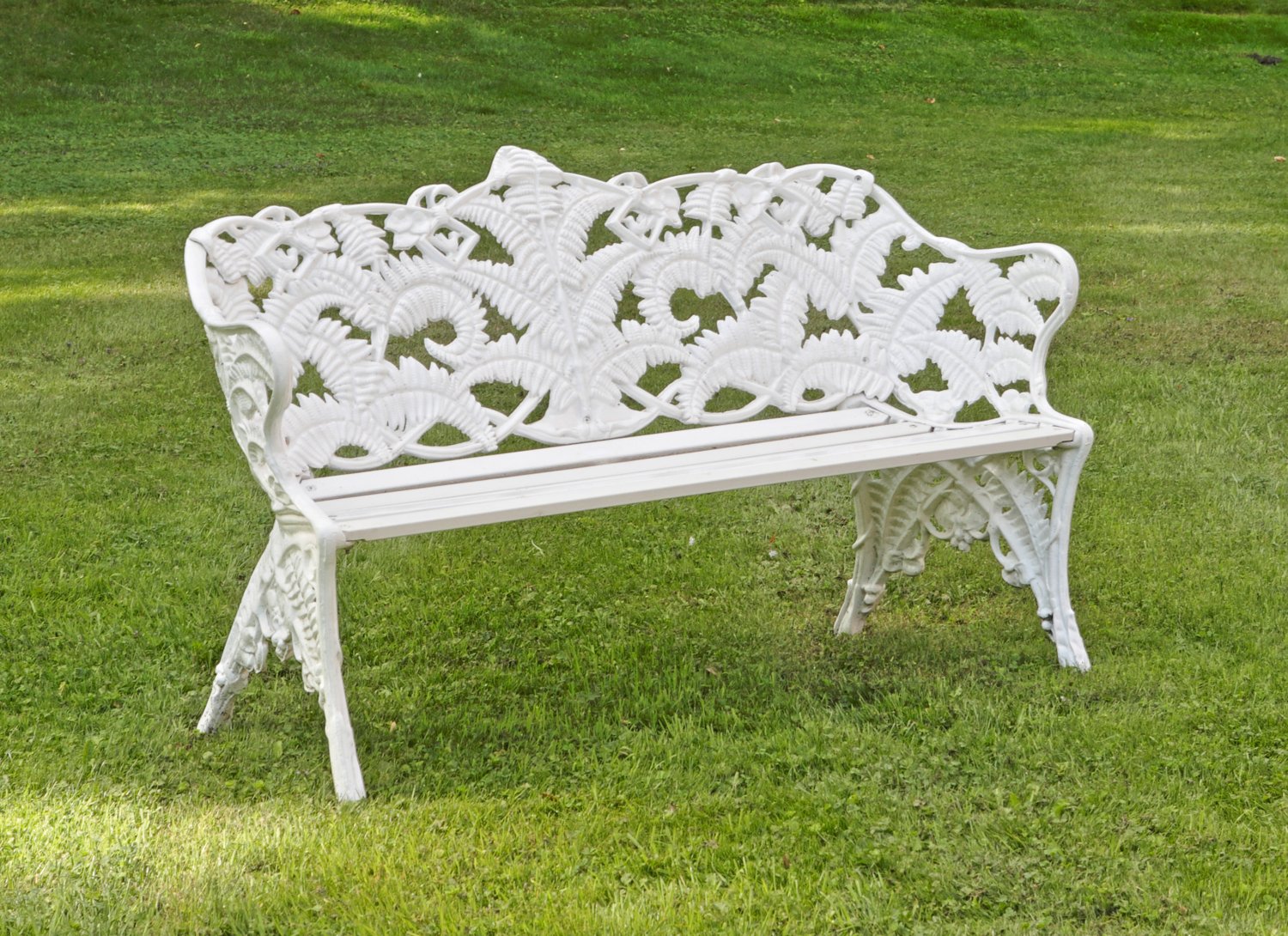 Metall und Holz, teilw. weiß lackiert. Geschwungener, durchbrochen gearbeiteter Korpus aus üppigen Farnblättern mit schlanken, vegetabil gestalteten Beinen. Sitzfläche aus schmalen, gekanteten Stegen. Bez. "Riab". H. 88 cm. 142 cm x 52 cm. Sitz-H. 41 cm.