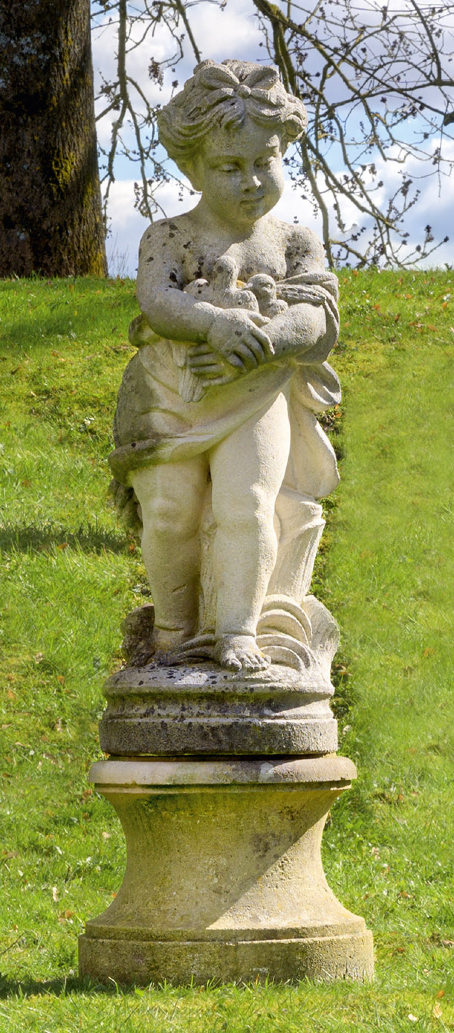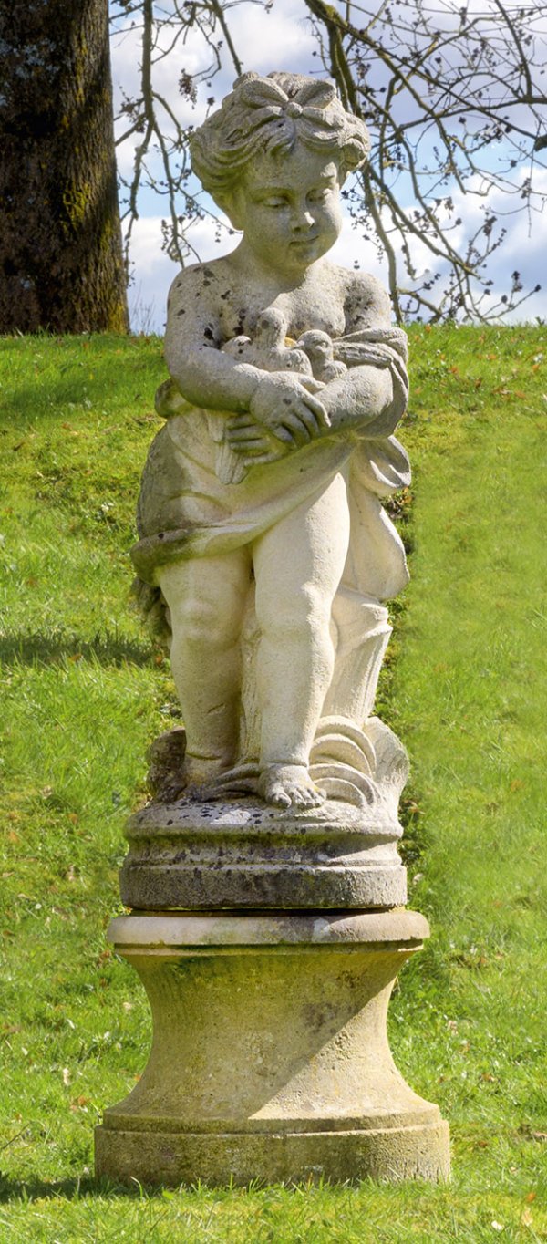 Sandsteinguss. In der Tradition des Barock bzw. Rokoko gestaltete, dekorative, vollplastisch gestaltete Skulptur. Auf einer runden Plinthe stehendes Mädchen, mit Ihren Armen zwei Vögel vor ihrer Brust haltend. Mittig einschwingender, runder Sockel mit ausgestellter Basis und Deckplatte. Skulpturen-H. ca. 99 cm; Ges.-H. ca. 130 cm.