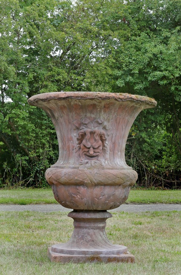 Terrakotta. Über quadratischer Plinthe balusterförmiger Korpus, seitlich mit reliefplastischen Maskarons im Groteskstil sowie weit ausschwingendem Lippenrand. Umlaufend der Wandung breiter Lorbeerfries sowie flache Kanneluren mit Blütendekor. Altersspuren. H. 149 cm.