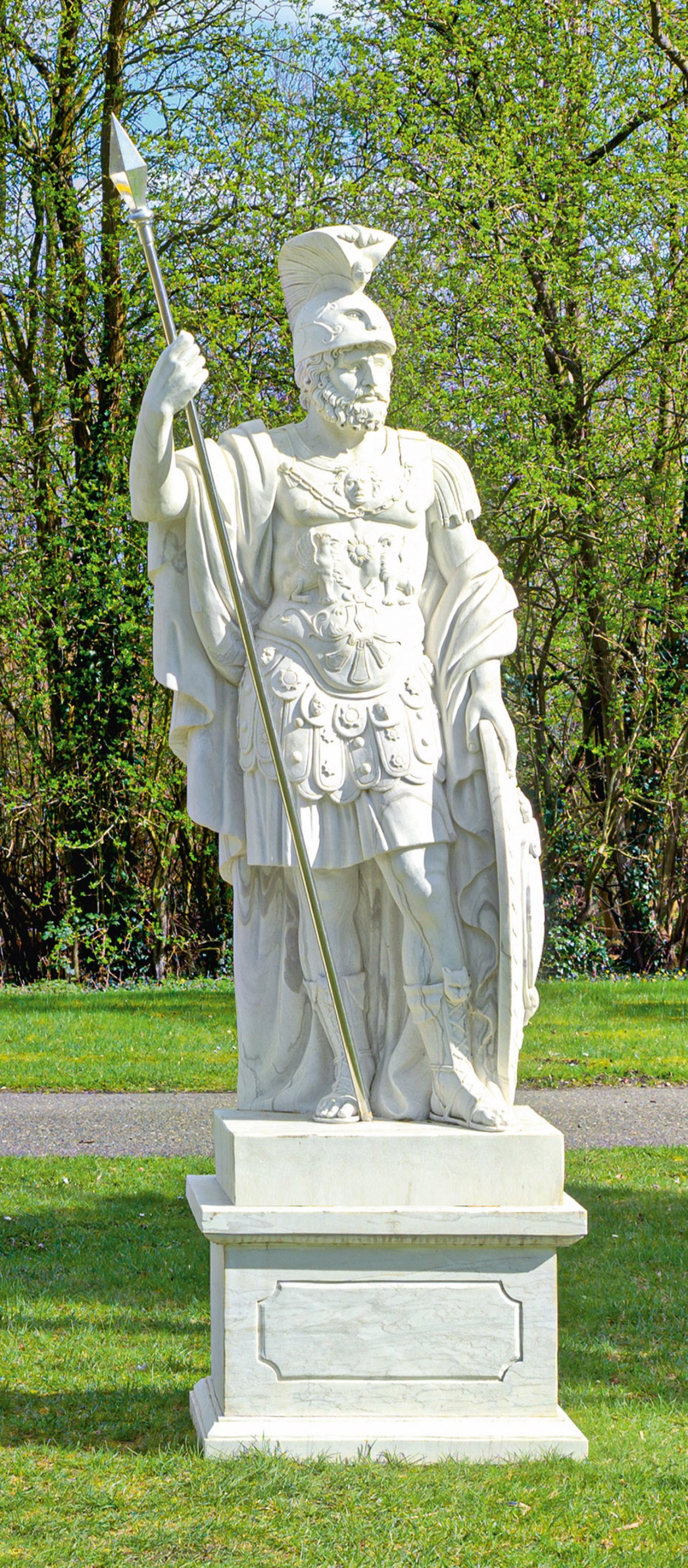 Weißgrauer Marmor. Der römische Kriegsgott wird in voller Rüstung dargestellt, er trägt einen Muskelpanzer mit Pteryges, Mantel, Beinschienen und einen reich verzierten Helm, hält mit der linken Hand ein Schild, die rechte Hand erhoben für einen Speer. Vollplastische, große Skulptur nach dem berühmten, monumentalen römischen Original, ausgestellt in den Kapitolinischen Museen in Rom (Inv-Nr. 58). Diese stammt höchstwahrscheinlich aus dem frühen 2. Jh. n. Chr. und wurde im 16. Jh. in den Ruinen des Nerva-Forums (auch Forum Transitorium) in Rom gefunden. 1738 erwarb Papst Clemens XII. Corsini die Skulptur, ließ sie ergänzen, so dass sie seit 1740 in den Museen ausgestellt ist. Helm ger. best.; Skulpturen-H. ca. 208 cm; Sockel-H. ca. 55 cm; Ges.-H. ca. 263 cm.