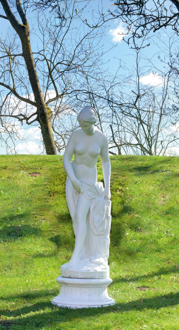 Weiß gefasster Steinguss des 20. Jhs., nach der berühmten Marmorskulptur im Louvre; gesonderte Säulenplinthe aus gleichem Material mit Blattrelief. Auf einem Natursockel stehende, sich an einen Baumstumpf stützende junge Frau, ihre linke Fußspitze vorsichtig ins Wasser tauchend. "La baigneuse" gehört zu den bedeutendsten Schöpfungen Falconets und Skulpturen des 18. Jhs., das durch die besonders subtile Behandlung des anmutigen Aktes herausragt. 1757 stellte Falconet die Skulptur mit phänomenalem Erfolg im Salon in Paris aus, so das er selbst mit Repliken beauftragt wurde und sie ab 1758 auch in Biskuitporzellan ausgeformt wurde. H. ca. 136 cm.
