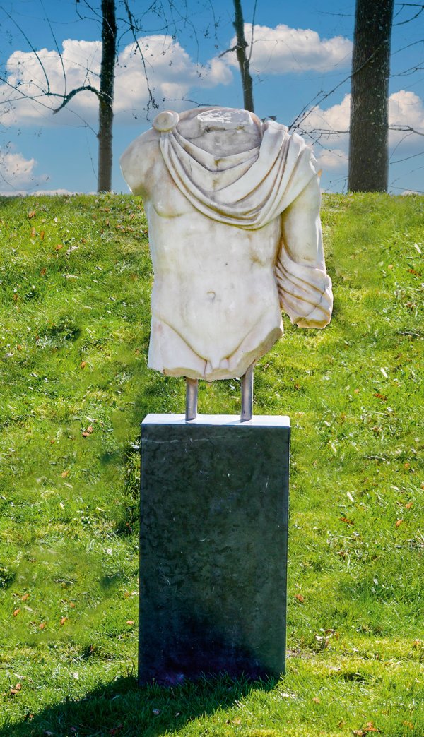 Marmor, der Sockel aus dunkelgrauem Marmor, Montierung durch zwei Edelstahlstäbe. Nach einem antiken, römischen Vorbild gestaltete, vollplastisch gearbeitete Skulptur mit über der rechten Schulter gefibeltem Mantel, wohl Darstellung des Hermes. Torso-H. ca. 58 cm, Ges.-H.- ca. 128 cm.