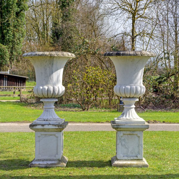 Weißer, hellgrau gemaserter Marmor. Über profiliertem Podestockel, allseitig mit leicht zurückgesetzten Reserven quadratische Deckplatte. Oberhalb balusterförmiger, kraterartiger, an der Basis mit Zungenfries dekorierter, godronierter Korpus mit weit ausschwingendem Lippenrand aus flachem Eierstabfries. H. 180 cm.