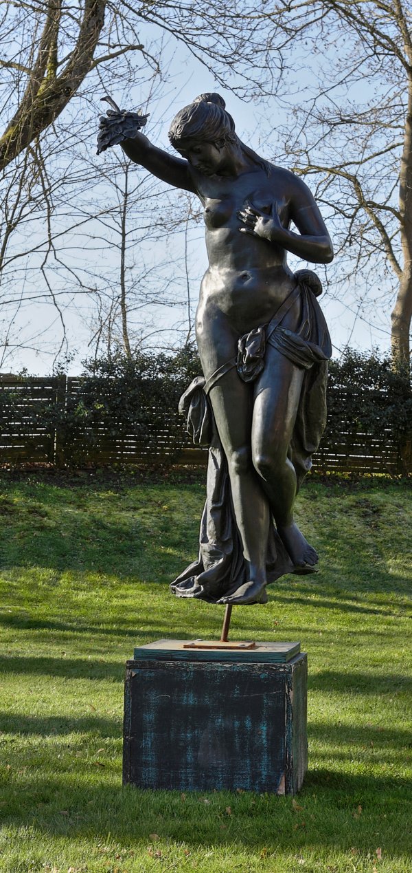 Kupfer, dunkel patiniert; gefasster Holzsockel, Eisenmontierung. Vollplastische, lebensgroße Darstellung, inspiriert durch Figuren der Belle Époque. Die römische Göttin der Blüte und des Frühlings wird als junge Frau in schwebender bzw. schreitender Pose stehende, subtil erotische Aktfigur geschildert, in der rechten Hand eine große Blüte haltend und die linke Hand an ihre Brust legend; durch einen diagonal um ihre Hüfte gelegten Gürtel drapiertes, die Scham bedeckendes Tuch. Ger. gedellt. H. ca. 158 cm; Ges.-H. ca. 220 cm.