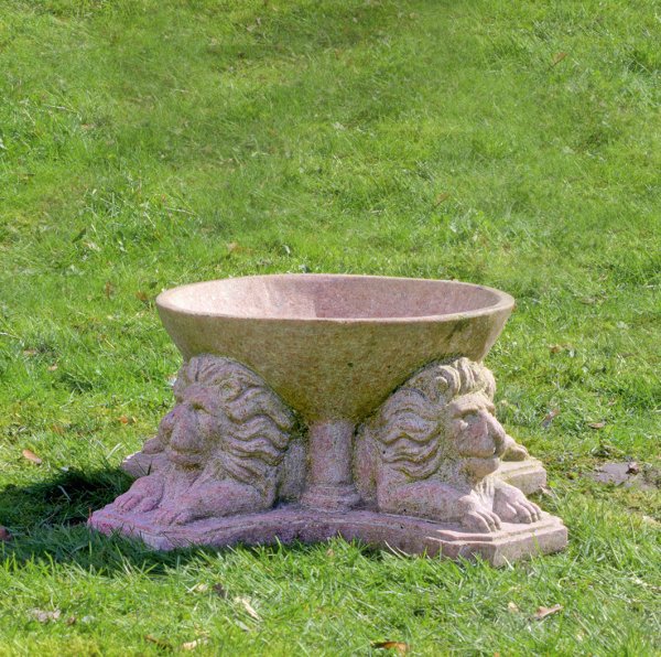Roter Marmor. Über flacher, konkav eingezogener und umlaufend profilierter Plinthe kurzer Schaft sowie plastisch gestaltete, ruhende Löwenfiguren als Träger für flach gemuldete Schale mit glatter Wandung. H. 23 cm.