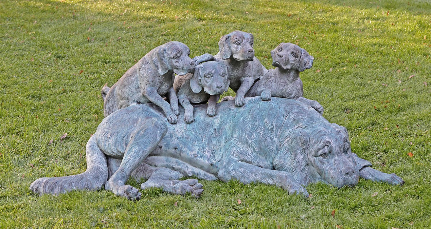 Bronze, in hellgrauen und grünlichen Tönen patiniert. Vollplastische, lebendige, realistische, naturnah beobachtete Darstellung. Auf dem Boden liegend eine Hundemutter in ruhiger Pose, die im Kontrast zu vier auf ihrem Rücken herumtollenden Welpen steht. H. ca. 65 cm; B. ca. 152 cm.