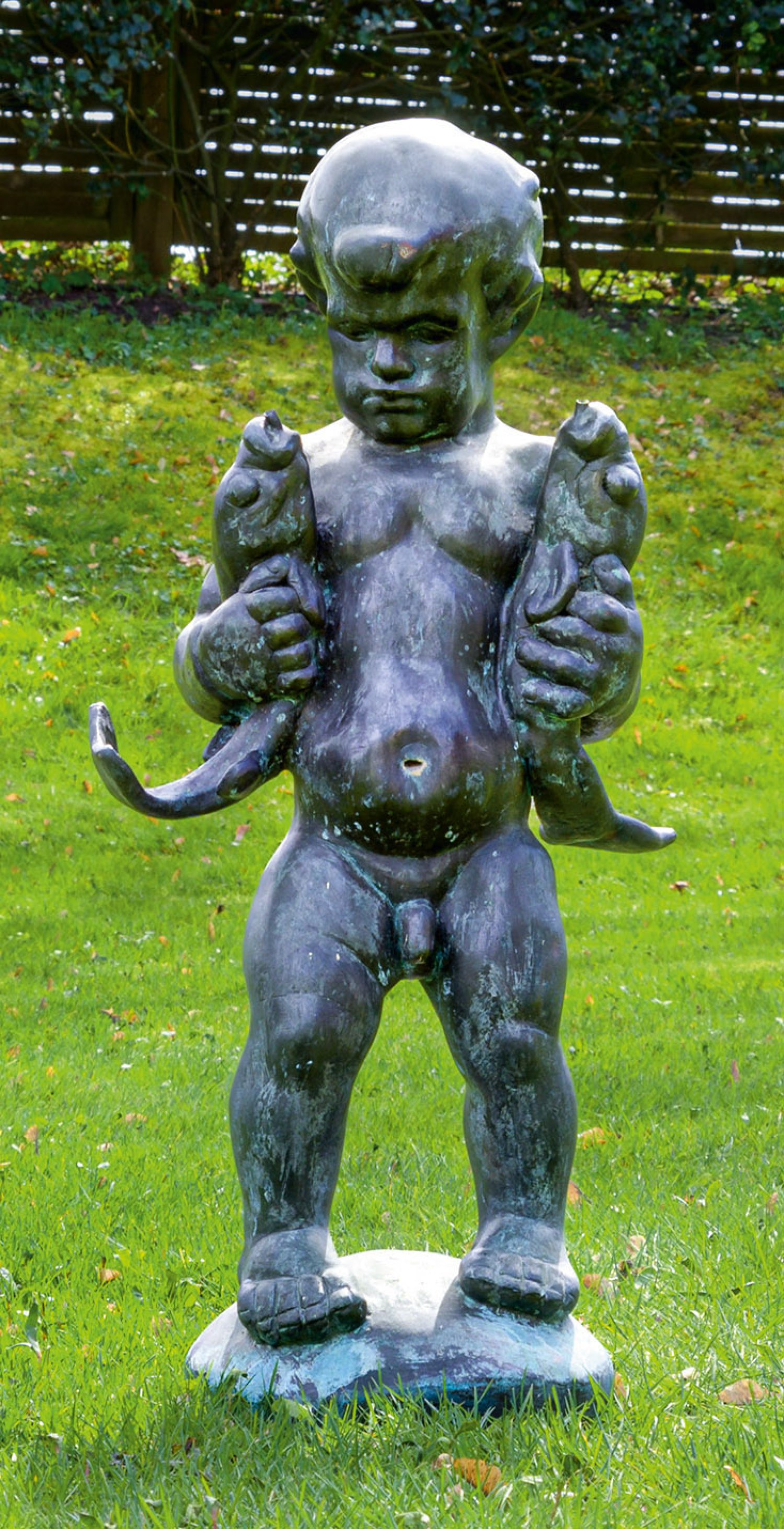 Kupfer-Galvanoplastik, schwarz und grün patiniert. Nach der bekannten, 1911 geschaffenen Plastik "Fischpüddelchen" von Hugo Lederer vor dem Baptisterium des Aachener Domes, welche die Akfigur eines Puttos mit zwei Fischen in den Händen darstellt. Die Figur wurde 1943 eingeschmolzen und 1954 nach dem zerstörten Vorbild von dem Bildhauer Heinrich-Clemens Dick neu gestaltet. H. 66 cm.