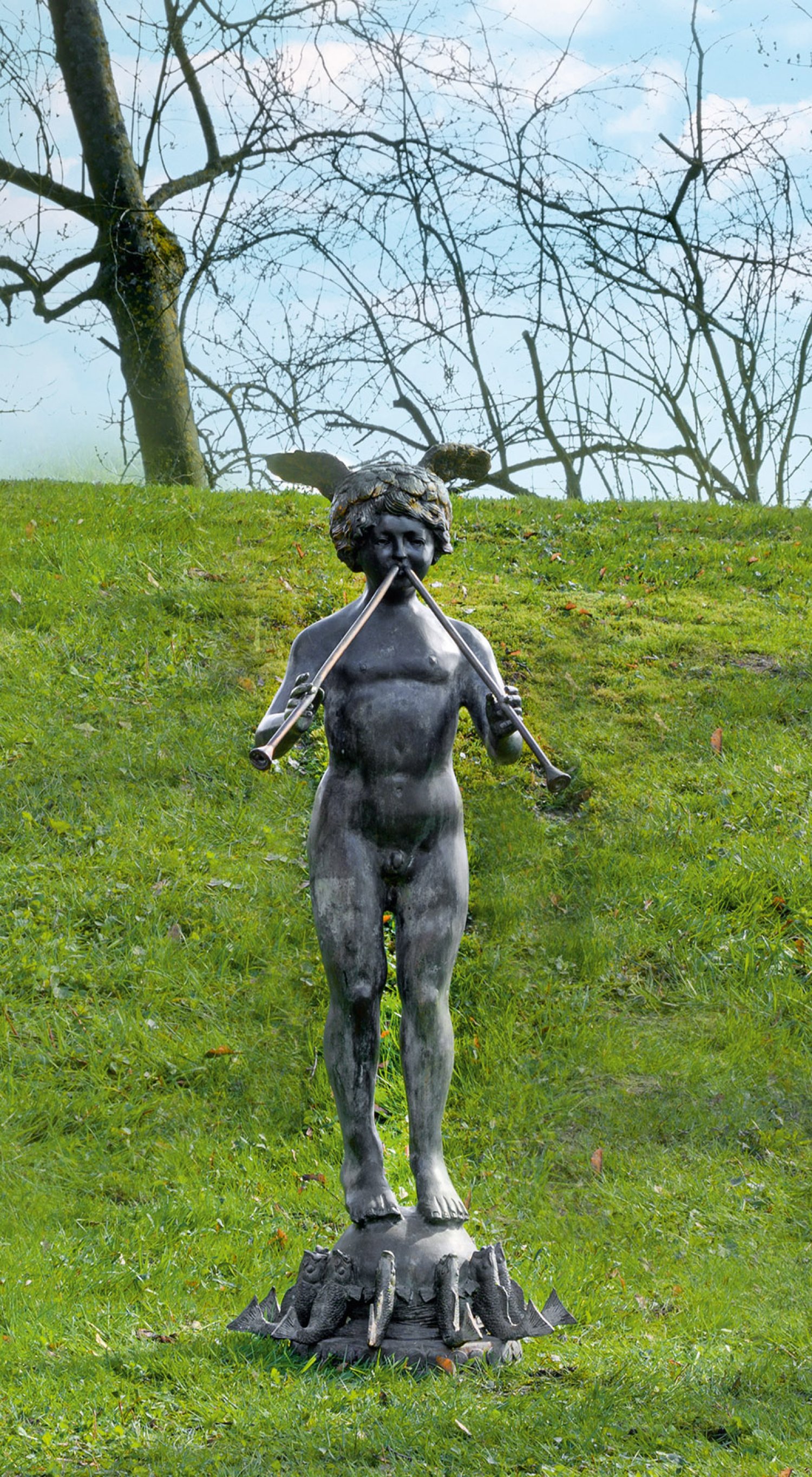 Bronze, patiniert. Vollplastische Statue des Merkurknaben als Aktfigur, auf einer Kugel stehend und mit beiden Händen eine Aulos-Flöte haltend. Auf der Basis des Sockels ein plastischer Fries aus nebeneinander geordneten Fischen mit zum Merkurknaben erhobenen Köpfen. H. 110 cm.