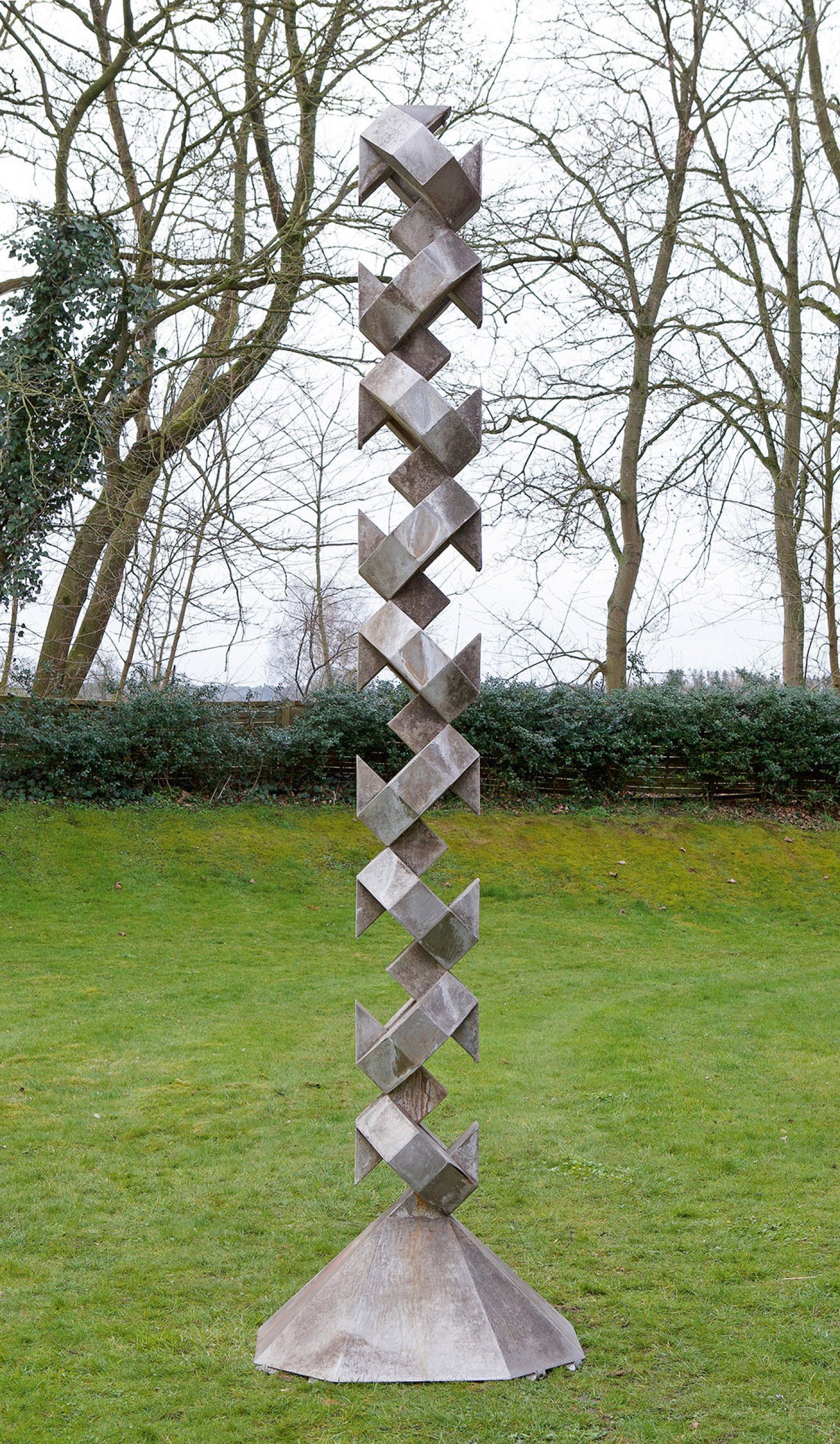 V2A-Edelstahl und verzinktes Eisen. Sign.; Auf einer oktogonalen, sich pyramidial verjüngenden Basis stehende, hohe, schlanke Stele aus miteinander verbundenen, geometrischen Elementen. Stiltypische Arbeit des Bildhauers, der oft moderne Materialien wie V2A-Stahl für seine figurativen und modular aufgebauten Skulpturen einsetzte. Lauer studierte 1961-1967 Bildhauerei an der Akademie der Bildenden Künste in Karlsruhe bei Hans Kindermann (Abschluss 1967 als Meisterschüler); 1973/1974 erhielt er eine Gastprofessur an derselben Akademie, danach war er dort 1975-2004 als ordentlicher Professor tätig. 1994 gründete er mit Ingrid Dahn und Max Schmitz die Künstlergruppe "Ataraxia". Lauer realisierte eine Reihe großer Freiskulpturen für den öffentlichen Raum. H. ca. 350 cm.