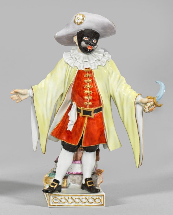Auf quadratischer Plinthe stehender Komödiant mit aufwendigem Kostüm, weißer Halskrause, schwarzer Maske und großem Hut. In der linken Hand ein Krummdolch haltend. Bücherstapel als Stütze. Polychrome Malerei mir Goldstaffage. Entw. Johann Joachim Kaendler. Modell-Nr. 64568. Schwertermarke. H. 18,5 cm.