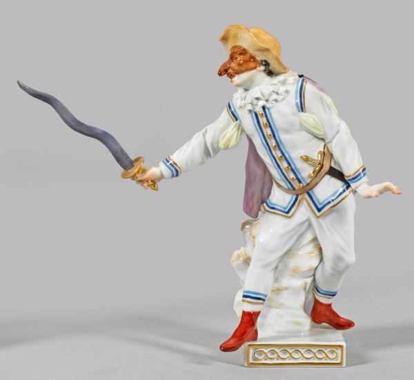 Auf quadratischer Plinthe stehender Komödiant in aufwendigem Kostüm mit Umhang, weißer Halskrause, brauner Maske und Hut. In der rechten Hand ein Schwert haltend. Polychrome Malerei mir Goldstaffage. Entw. Johann Joachim Kaendler. Modell-Nr. 64571. Rest.; Schwertermarke. H. 18 cm.