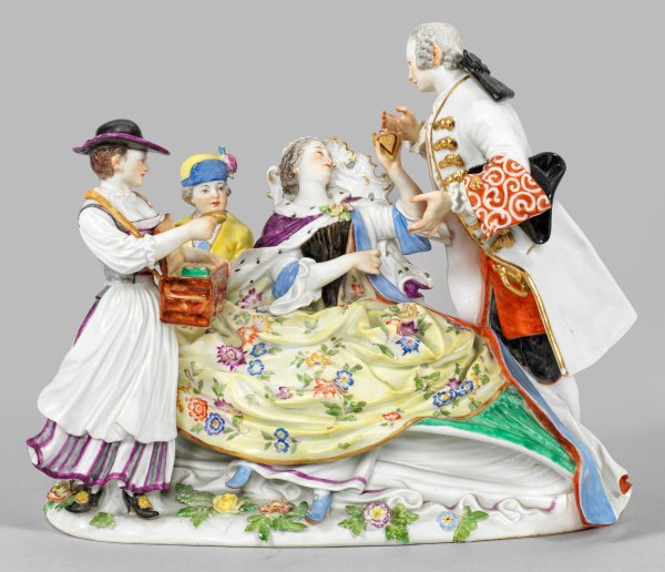 Auf einem Stuhl sitzende Dame im Krinolienkleid und hermelinbesetztem Umhang, ihrem Verehrer eine Herzdose zeigend. Seitlich stehende Tirolerin mit geöffnetem, gefülltem Schmuckkasten sowie Diener ein Tableau mit Schmuck präsentierend. Polychrome Malerei mit Goldstaffage. Entw. Johann Joachim Kaendler. Modell-Nr. 100. Minim. best; Haarriss. Schwertermarke. H. 21 cm. L. 25 cm.