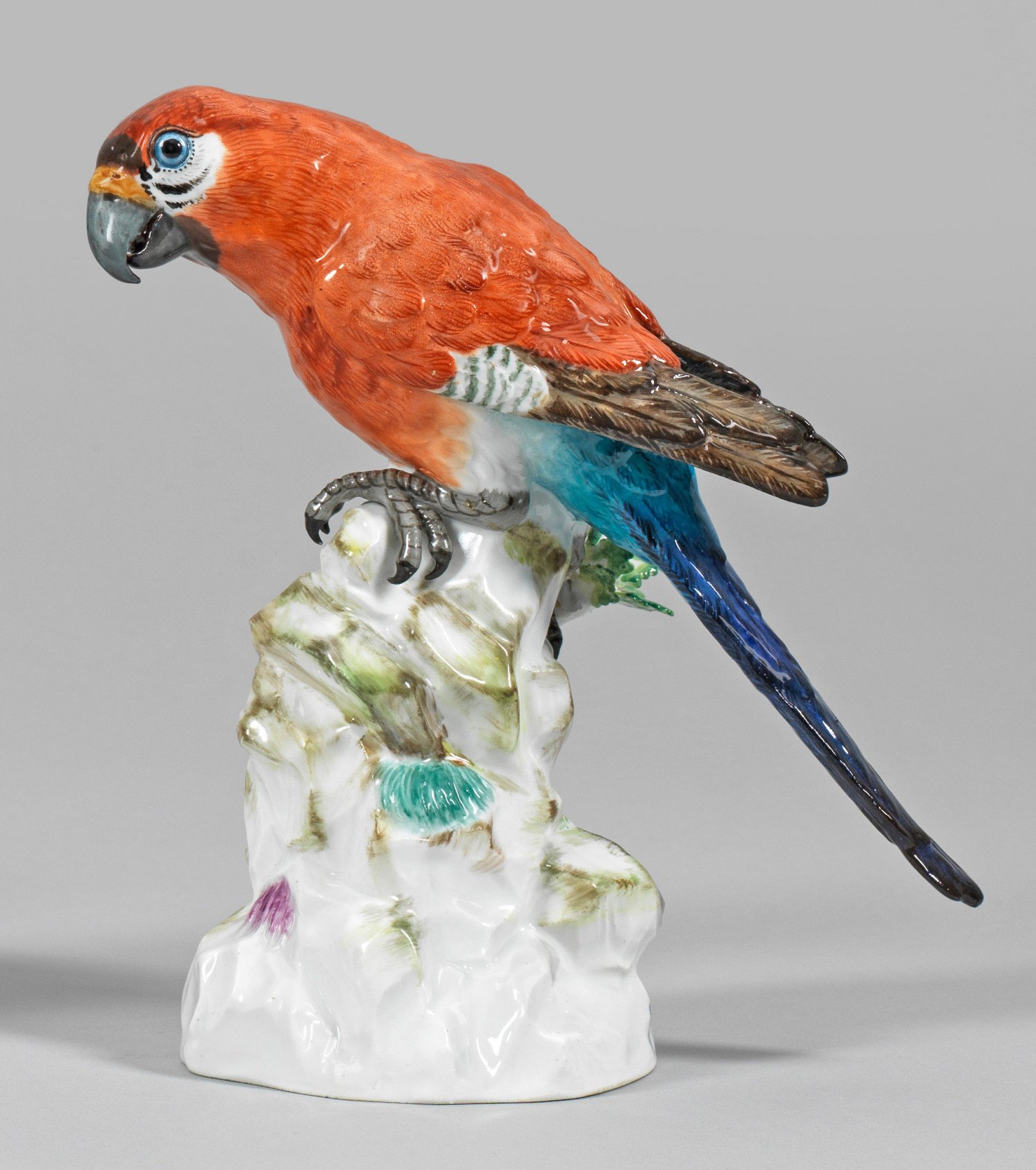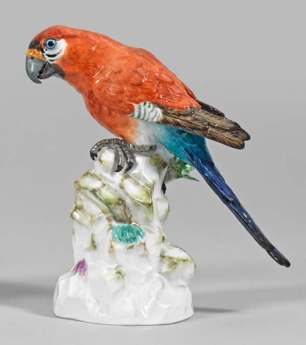 Über Felssockel mit plastisch aufgelegten Blättern hoher Eichenstamm mit sitzendem Papagei. Reliefiertes, farbenprächtig staffiertes Gefieder. Polychrome Malerei. Entw. Johann Joachim Kaendler. Modell-Nr. 644 a. Rest.; Schwertermarke. H. 20,5 cm.