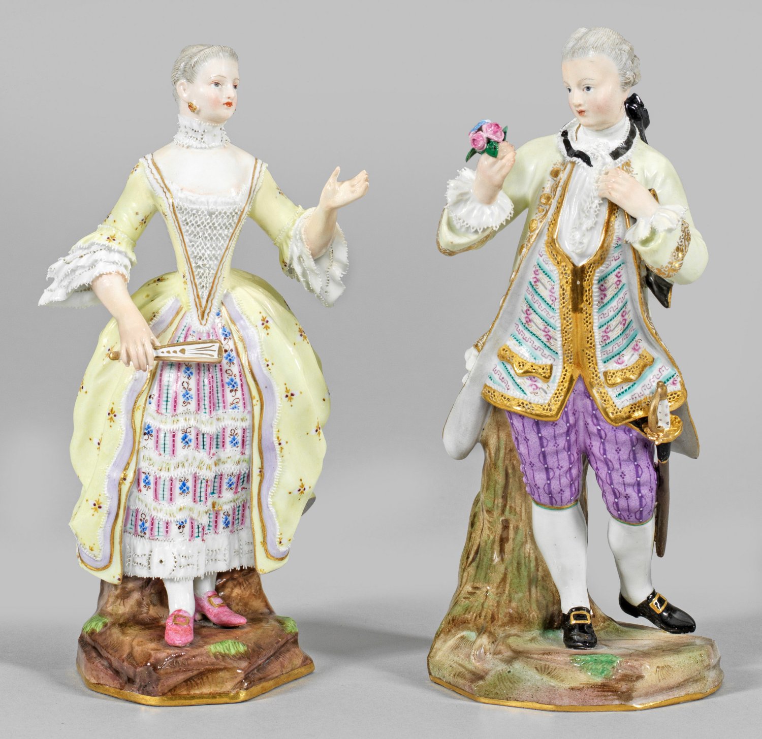 Auf naturalistisch staffiertem Felssockel stehende Dame mit Fächer bzw. stehender Kavalier mit Rosenstrauß in eleganter, höfischer Kleidung mit Spitzenputz. Polychrome Malerei mit Goldstaffage. Entw. Johann Joachim Kaendler und Mitarbeiter. Modell-Nr. A 56 und A 58. Unw. rest.; Minim. best.; Schwertermarke. H. 18,5 cm - 19,5 cm.