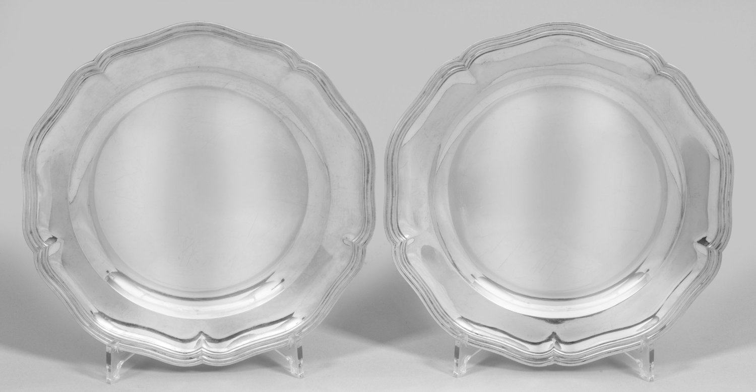 A pair of rare and heavy Belgian Baroque silver plates. Monogrammed. Test, assay and master´s mark "MD". Assay mark of the Prince Bishop Carl Nicolaus Alexander v. Oultremont (1763-1771) and date letter "F".
