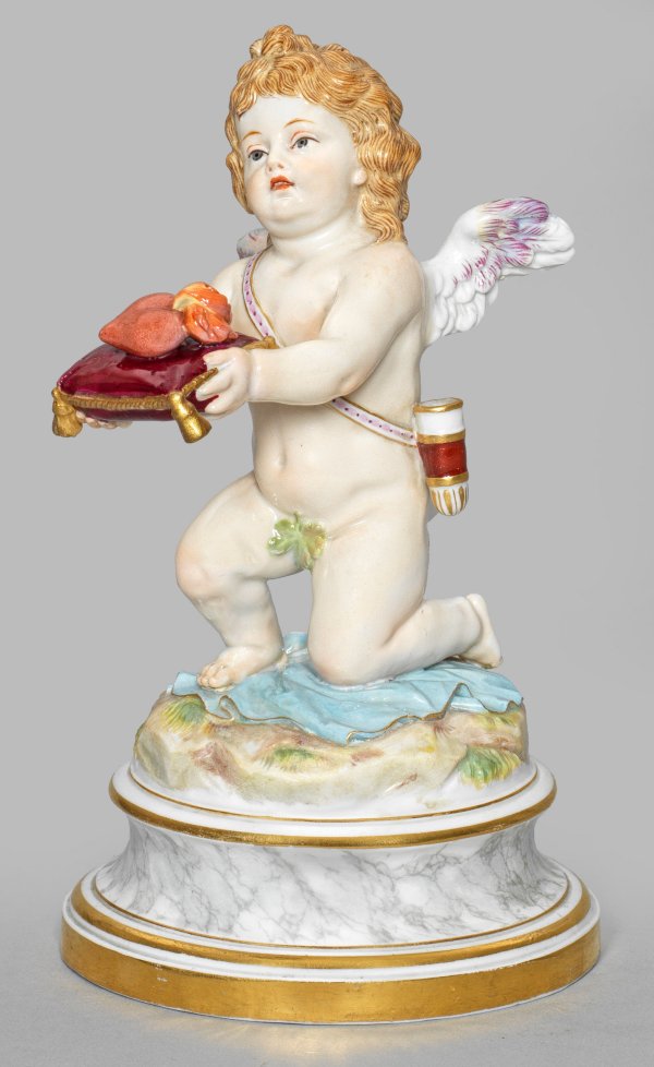 Auf profiliertem, marmoriertem Rundsockel mit felsigem Terrain kniender Amor, auf einem purpurfarbenem Quastenkissen ein flammendes Herz anbietend. Polychrome Malerei mit Goldstaffage. Entw. Heinrich Schwabe. Modell-Nr. L 122 (hier nicht eingeritzt). Unw. rest.; Schwertermarke. H. 16,5 cm.