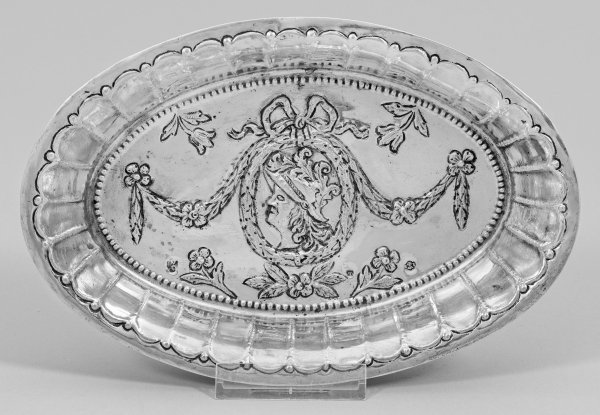 Silber. Ovaler Korpus mit aufsteigend sich erweiterndem und von zungenfriesähnlichem Dekor umzogenem Rand. Im Spiegel ein reliefplastisch getriebener, antikisierter Männerkopf mit Helm im Profil, gerahmt von Lorbeerkranz, Festons, Blüten und Schleifen. Gest., Beschauzeichen mit 12 Lot, Jahresbuchstabe "T", Meister Johann Michael Schlieter/Schlüter (Meister seit 1769). Gew. ca. 155 g. H. 3,2 cm. 22 cm x 14,7 cm.