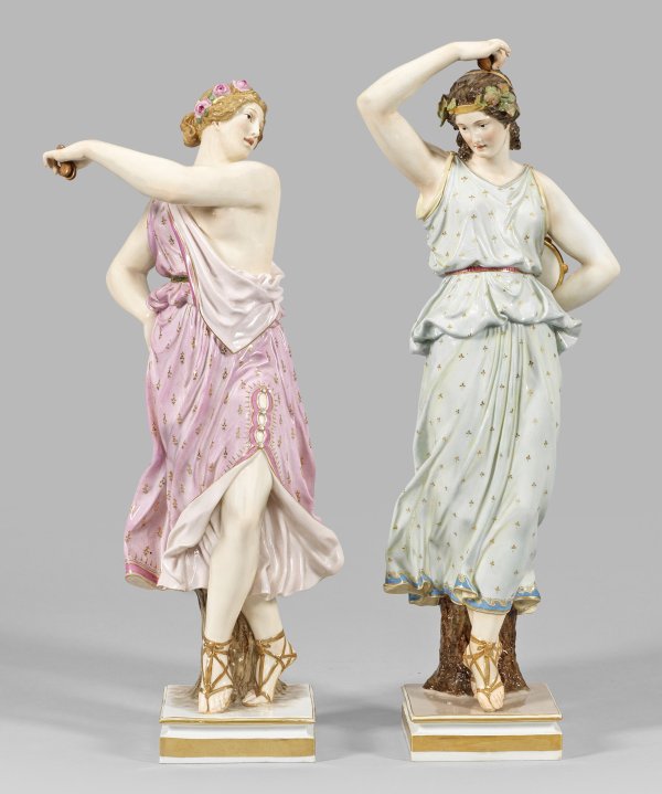 Auf quadratischer, profilierter Plinthe vollplastisch gearbeitete Porzellanfigur einer antikisierenden, in tänzerischer Pose stehenden, jungen Frau in roséfarbenem bzw. seegrünem, von kleinen Goldblüten gemustertem Gewand, das Haar von einem goldradierten Band mit Rosenblüten bzw. Weinlaub geschmückt. In den Händen Kastagnetten bzw. ein Tamburin haltend. Polychrome Malerei mit Goldkonturierung. Entw. Ernst Julius Hähnel, um 1880. Modell-Nr. L 171 und L 172. Unw. rest.; Schwertermarke. H. 48 cm - 49 cm. Meissen. Ende 19. Jh.