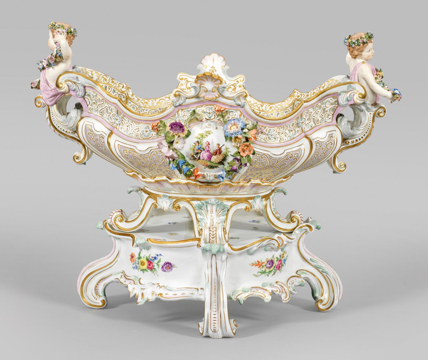 auf rechteckigem, von kräftigen, gebogten Blattfüßen getragenem, rocaillereliefiertem Sockel. Ovale Schale auf vier mit Akanthusblattreliefs belegten Volutenfüßen. Bombierter, durch vertikale Grate gegliederter Korpus über muschelreliefiertem Ansatz mit ausladender, passig ein- und ausschwingender Randzone in floraler Durchbrucharbeit mit Rosettenrelief im Rapport. Seitliche Handhaben in Gestalt von blumenbekränzten Puttenhermen mit Girlanden über schuppenartig reliefiertem, volutiertem Schaft. Umlaufend reliefplastischer, in zartem Rosa und Seegrün staffierter Rocailledekor. Auf der Wandung große, profilgerahmte Reserven mit arabeskem Goldrankendekor auf fliederfarbenem Fond, beidseitig ausgesparte, von üppigen, plastisch aufgelegten Blumenfestonen umzogene, muschelbekrönte Kartusche mit feiner Watteauszene, eine höfische Gesellschaft beim Musizieren wiedergebend. Im Spiegel große Goldrankenrosette sowie korrespondierende, breite Goldrankenbordüre. Sockel. Polychrome Malerei mit reicher Goldstaffage. Entw. Ernst August Leuteritz, um 1882- 1885. Modell-Nr. N 129 und 2772.; Schwertermarken. Meissen. 2. Hälfte 19. Jh. Schalen-H. 30 cm. 54 cm x 32 cm. Sockel-H. 13 cm. 27 cm x 27 cm.