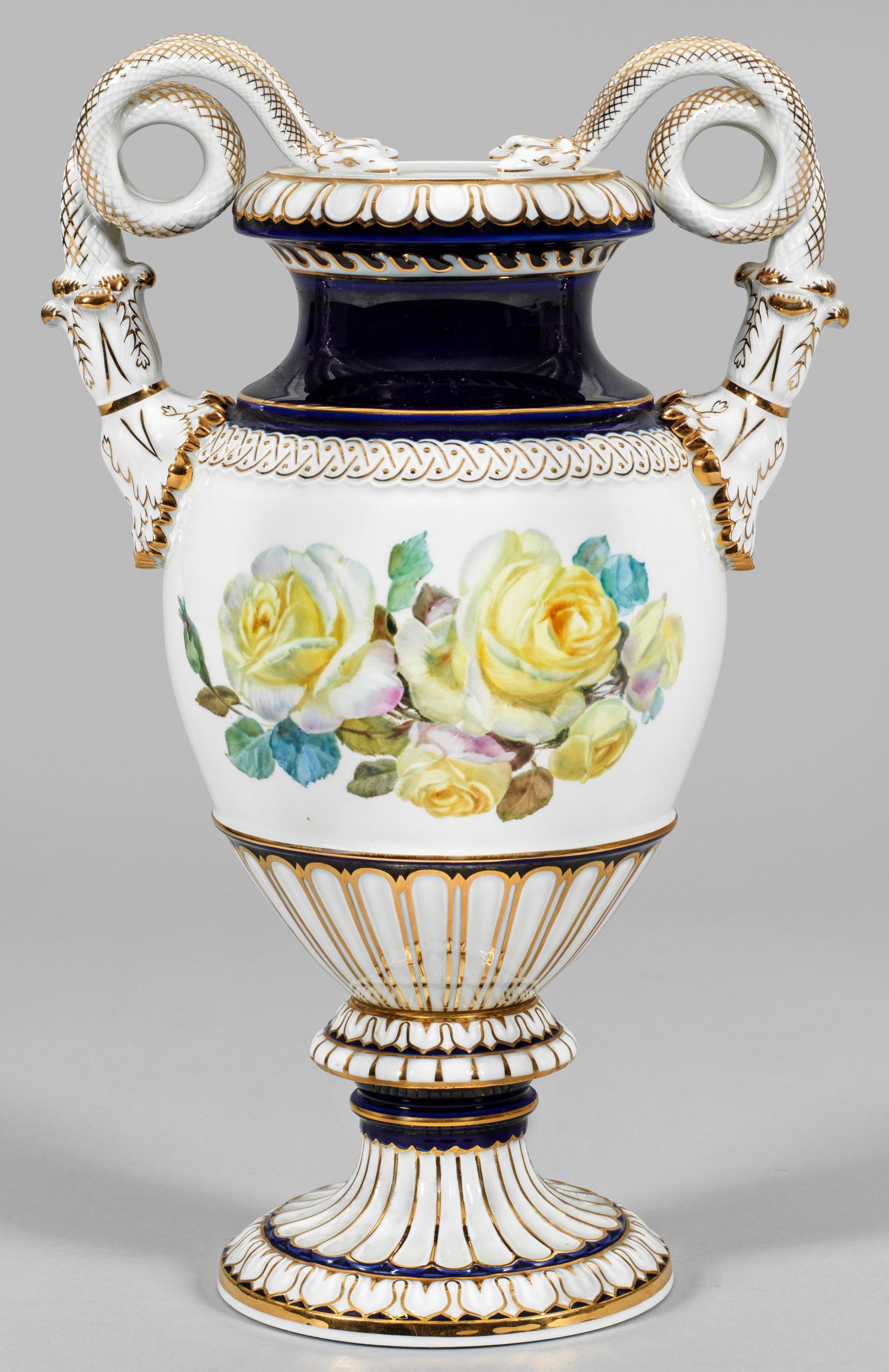 Amphorenförmiger Korpus, umzogen von reliefierten Ornamentbordüren. Seitlich aus plastischem Akanthusblattansatz aufsteigende Henkel in Gestalt von spiralförmig eingerollten Schlangenpaaren. Teilw. kobaltblauer Fond. Beidseitig der Wandung Blumenbukett aus gelben Rosen bzw. Rosenzweig in weicher, polychromer Malerei. Goldstaffage. Entw. Ernst August Leuteritz. Modell-Nr. 50824. Schwertermarke. H. 39,5 cm.