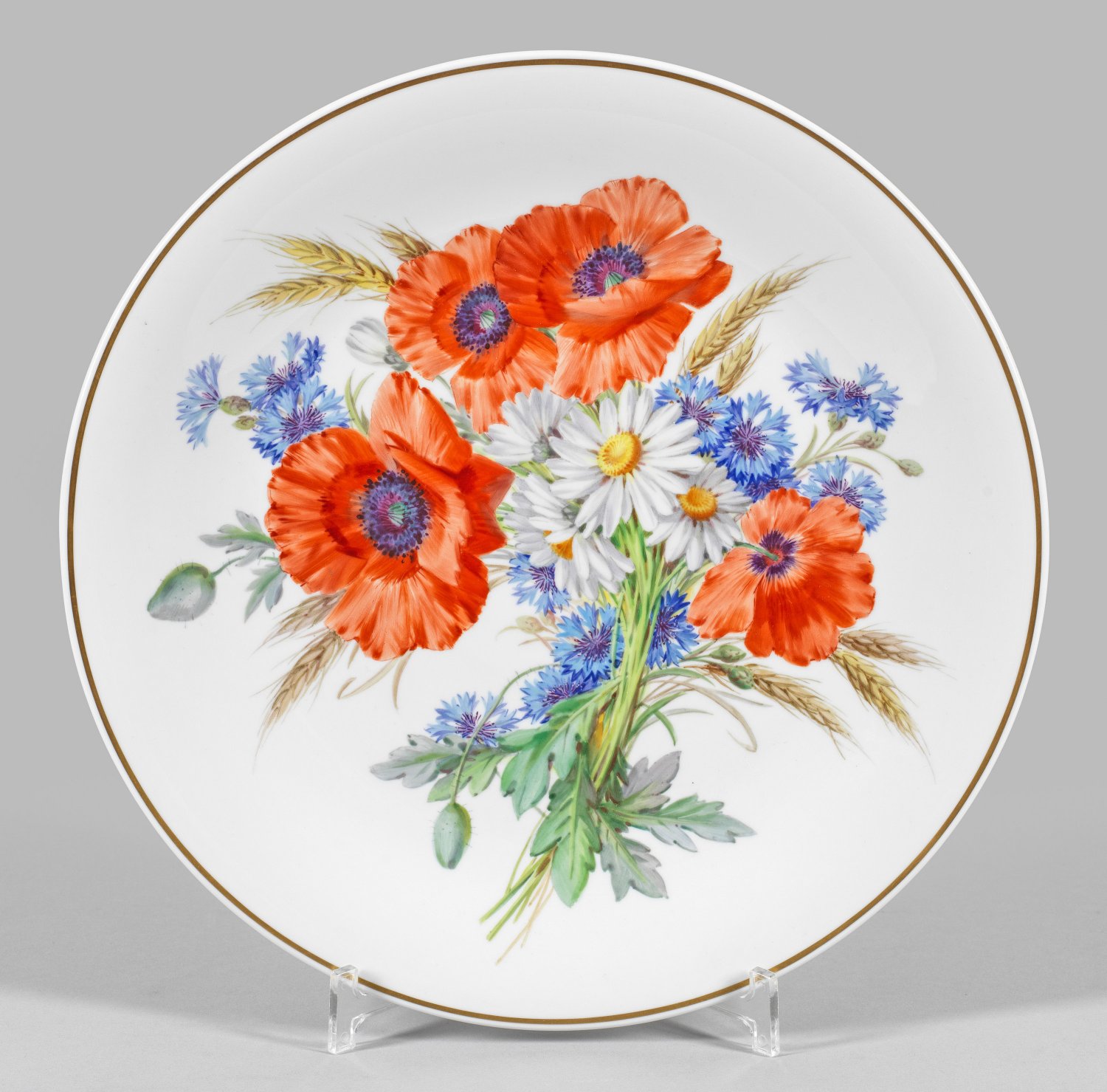 Runde, flach gemuldete Form. Im Spiegel großes sommerliches Blumengebinde aus roten Mohn- und Kornblumen, Margeriten und Getreideähren in polychromer Malerei. Goldrand. Rücks. Wandaufhängung. Schwertermarke. D. 35 cm.