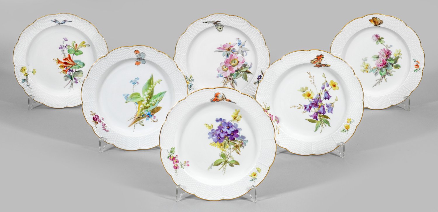 A collection of six porcelain plates with flower decor. Crossed swords mark.