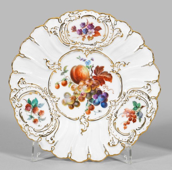 Runde, leicht vertiefte Form. Muschel- und Rocaillerelief sowie kartuschengerahmte, naturalistische Früchtegebinde in weicher, polychromer Malerei. Reiche Goldstaffage. Schwertermarke. D. 23,5 cm.