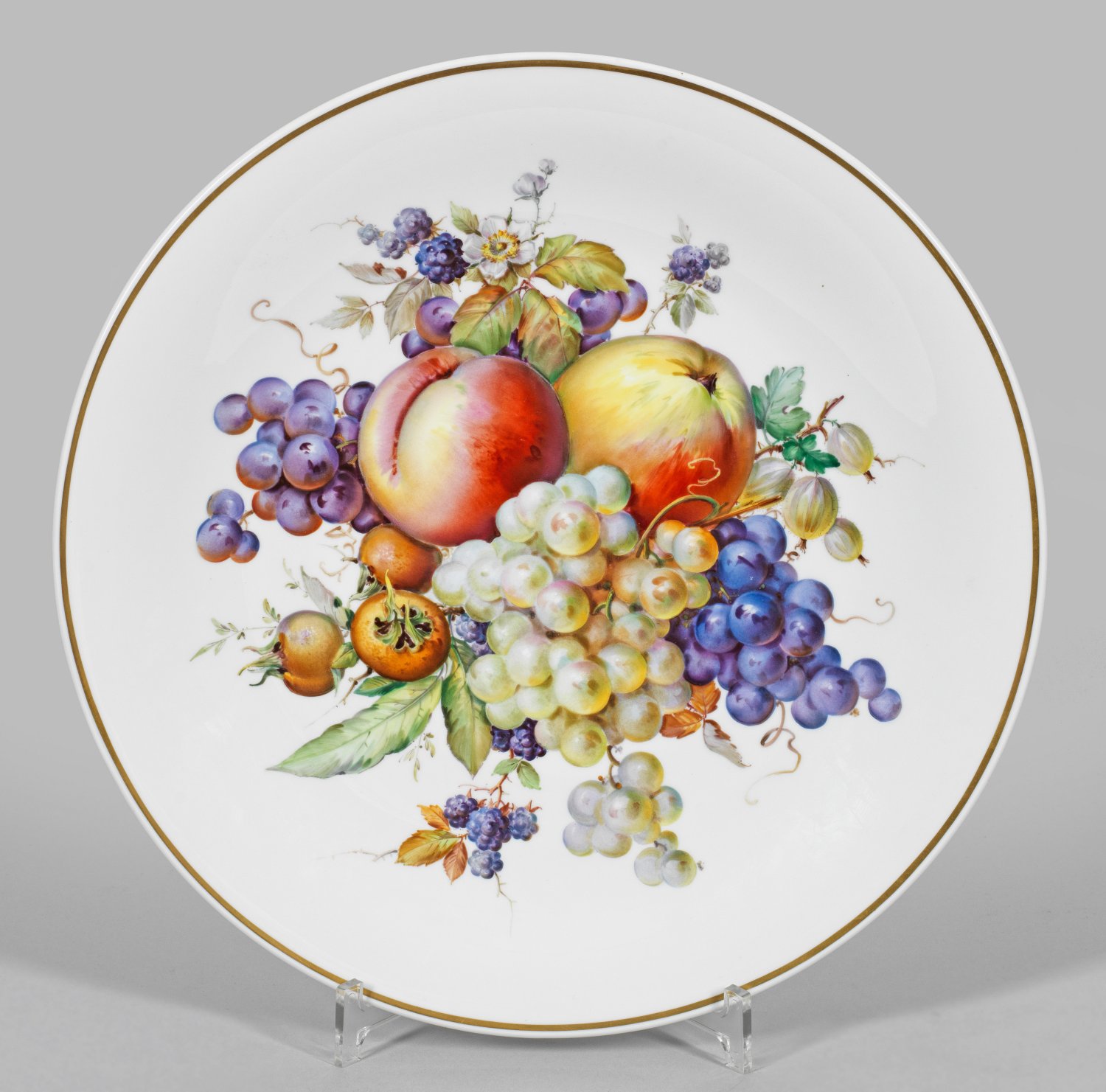 Runde, flach gemuldete Form. Im Spiegel großflächig angelegtes, herbstlich anmutendes Früchtearrangement aus hellen und dunklen Trauben sowie Pfirsichen in weicher, polychromer Malerei. Goldrand. Rücks. Wandaufhängung. Schwertermarke. D. 35,5 cm.
