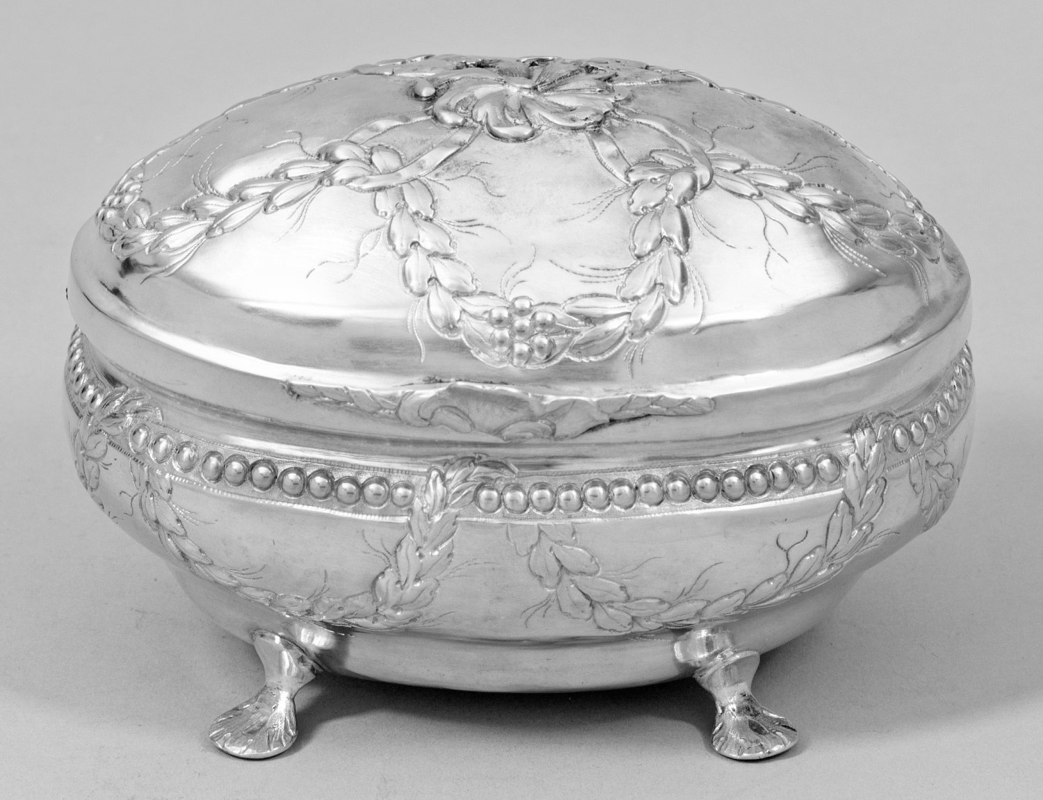 Silber. Vier stilisierte Blattfüße, übergehend in ovalen, gebauchten Korpus. Unterhalb des Wandungsrands umlaufend reliefplastisch getriebener Perlstabfries, umzogen von Festons aus Lorbeerblattranken. Scharnierter, gering gewölbter Deckel zentral verziert mit blütenförmiger Rosette, gerahmt von vierpassig geschwungenem, korrespondierendem Blatt- und Blütenkranz. Schmale Daumenrast. Innen vergoldet. Gest., Tremolierstrich, Beschauzeichen, Meister Daniel Matignon (wird Amtsmeister um 1763). Gew. ca. 240 g. H. 10 cm. 14 cm x 10,8 cm.