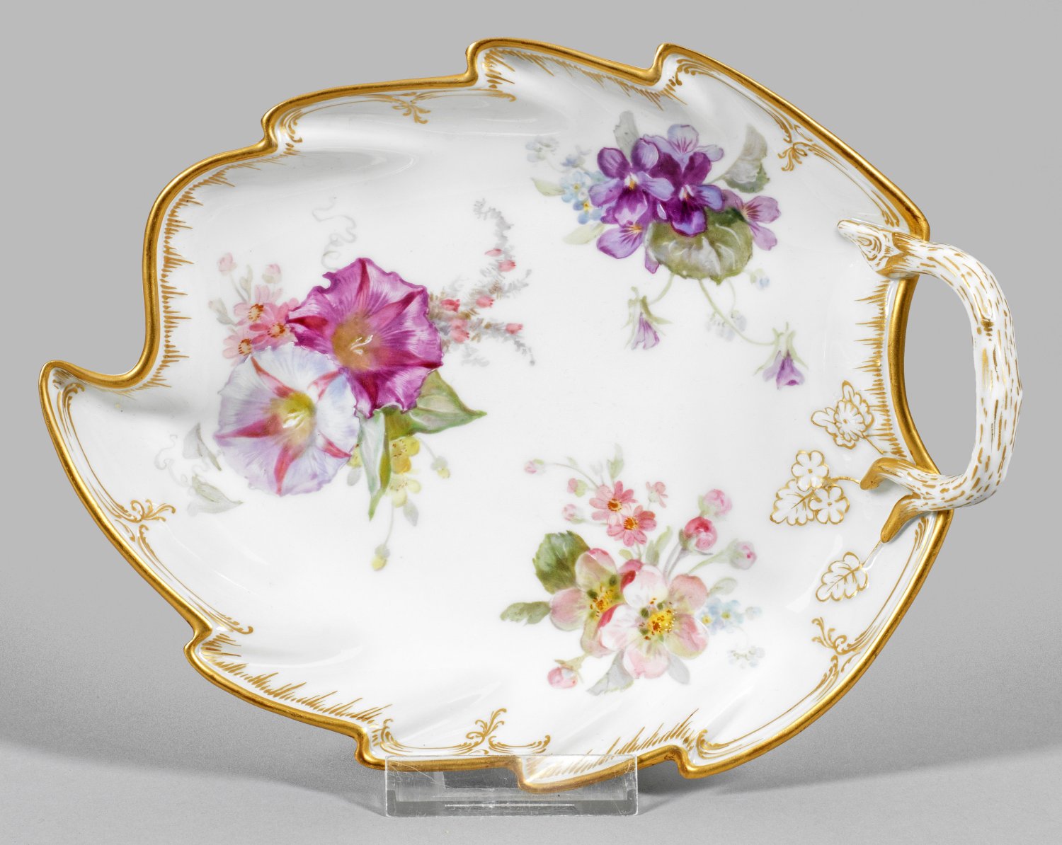 Gebogter Asthenkel mit Blütenrelief. Im Spiegel Blumengebinde in Weichmalerei. Reiche Goldstaffage. Zepter- und Malereimarke. 23 cm x 18 cm.