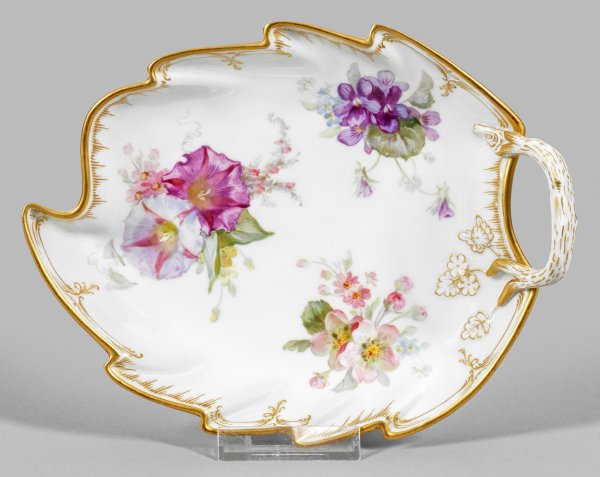 An early 20th C. leaf-shaped porcelain bowl with flower decor. Sceptre and painter's mark.