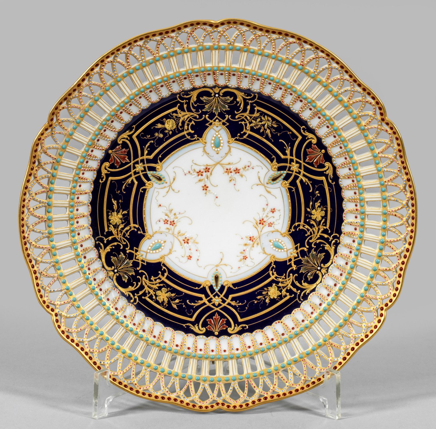 sog. Juwelenporzellan. Runde Form "Englischglatt" mit zweireihig, spitzbogenartigem und stabförmigem Durchbruch sowie passig geschweiftem Rand. Im leicht vertieften Spiegel und auf der Fahne reicher, feinliniger Relief- und farbig aufgeschmolzener, gehöhter Emaildekor aus Laub- und Bandelwerk, stilisierten Blüten und Tropfen und Perlen, teilw. auf kobaltblauen, zarten hellblauen Fonds. Dekormalerzeichen u.a. für Paul Rogge. Zepter- und Schwertermarke. D. 25 cm.