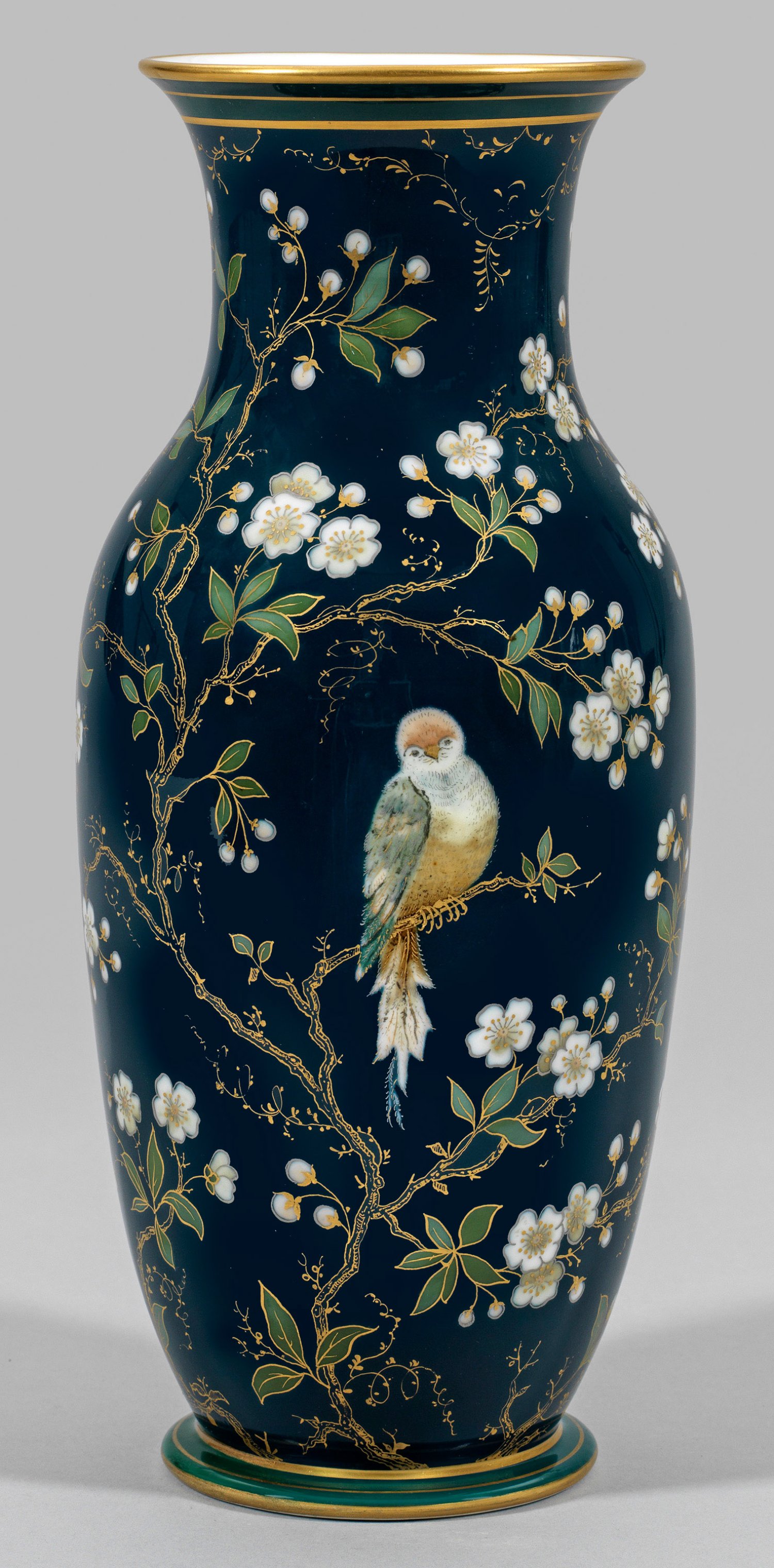 Sog. Modell "chinesisches Blumengefäß glatt". Über ausgestelltem Rundstand balusterförmiger Korpus mit eingezogenem Hals und ausschwingendem Rand. Auf der Wandung, in dunklem petrolfarbenem Fond, flächendeckender Dekor aus Kirschblütenzweigen mit einzelnen Schmetterlingen und schauseitigem, auf einem Ast sitzenden Vogel. Polychrome Unterglasur- sowie Gold- und Platinmalerei. Tannengrüne Fondbänder an Rand und Stand. Dekor-Entw. Rudolf Schenker. Rest.; Zepter- und Malereimarke. H. 32,5 cm.