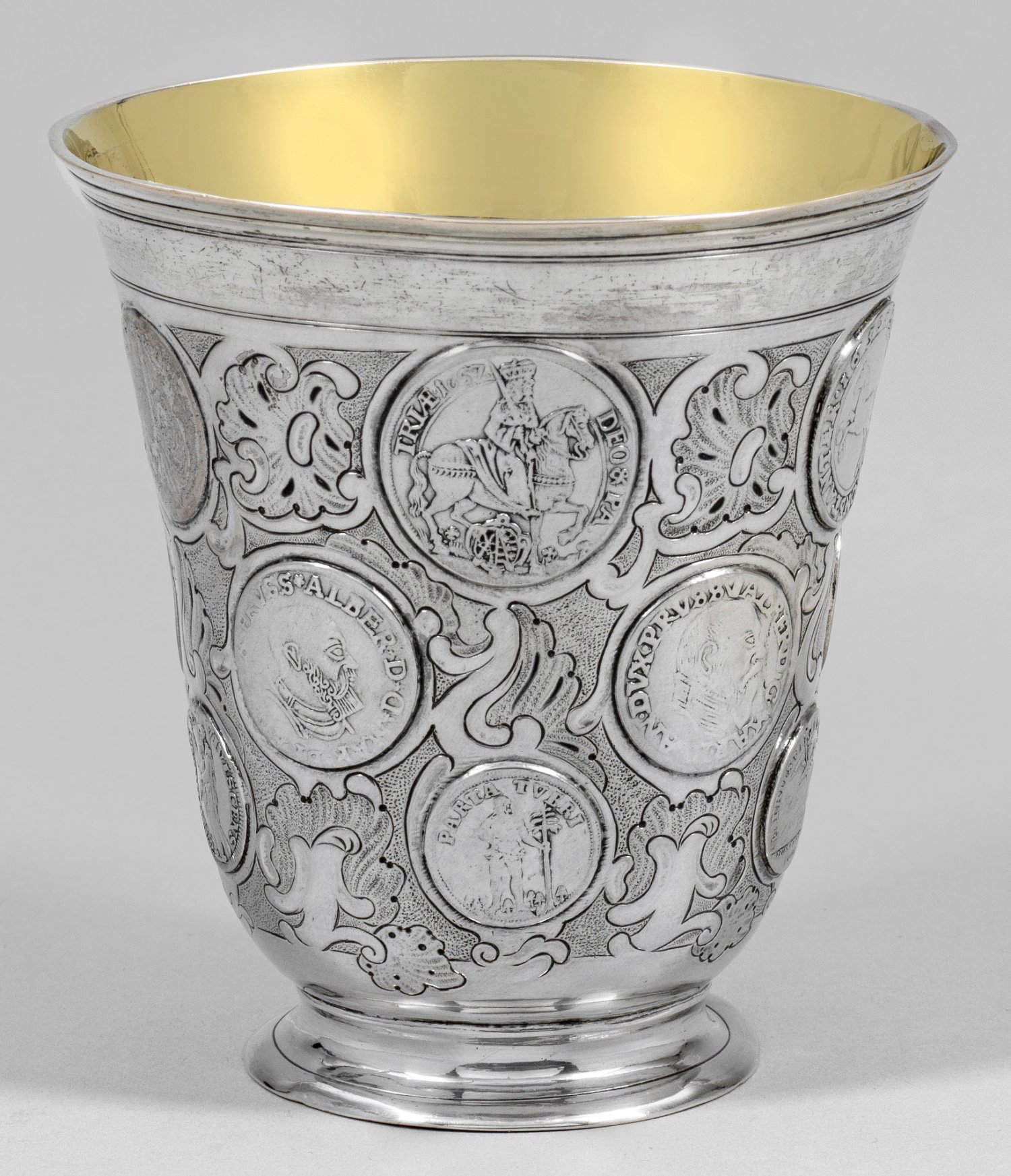 Silber, teilw. vergoldet. Glockenförmig aufschwingender Korpus über gekehltem Rundstand. Von Profillinien umzogener Lippenrand mit abgesetzter, glatter Randzone. Wandung umzogen von fein ziselierten Rocaillen und Voluten zwischen fünfzehn dreireihig versetzt eingelassenen Münzen, u. a. unterschiedliche Mariengroschen sowie ein Königsberger 3-Gröscher mit Profildarstellung von Albrecht von Brandenburg (1525-1568) aus dem Jahre 1558. Innen vergoldet. Gest., Tremolierstrich, Beschauzeichen, Meister Johann Christian Jacobi (wird Meister 1750) oder Johann Gabriel Jacobi (wird Meister 1761). Gew. ca. 130 g. H. 10 cm.